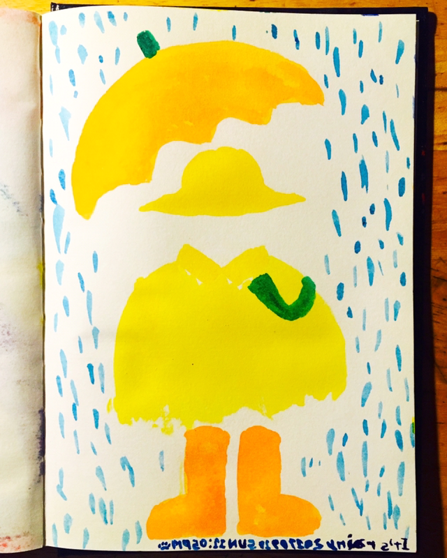 낭만적이라기보단 우중충한 느낌이 들어서 노란색으로 그림을 그리고 싶어서 붓에 물감을 잔뜩 묻히고 모친을 불러 노란색 하면 떠오르는 게 뭐냐고 여쭈니 '나비', '꽃', '햇님' 같은 끌리지 않는 항목들이 튀어나와서 고민하는데 불현듯 어렸을 때 입었던 노란색 우비가 떠올랐다.