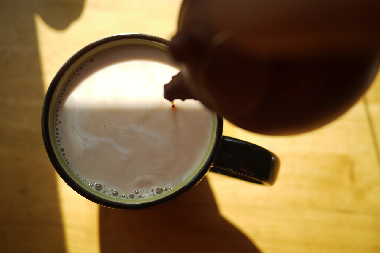 드디어 준비가 끝났다. 이제 진하게 우러난 보이차면 부어주면 된다. 하얀 우유 속으로 붉고 짙은 갈색 보이차가 섞여들며 혼돈을 만들었다가 결국 완벽하게 조화로운 색을 이룰 때 마시기 시작하면 된다.