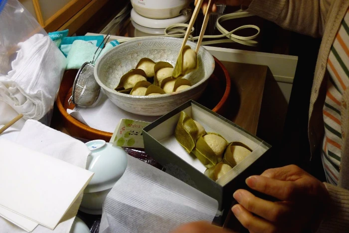 창밖으로는 조금 전까지 죽순 수확에 바쁘던 아빠가 다리 한가운데 서서 잉어들에게 먹이를 주는 모습이 포착됐다. 연못 위로 뻐끔거리는 잉어들의 입 크기에 놀랐다. 커다란 잉어들이 그렇게 많이 산다는 걸 처음으로 목격했기 때문이다. 마침내 아빠까지 착석하자 차 마시는 시간이 돌아왔다. 간소하나마 정해진 규칙이 있는 일본의 다도의 정신과 순서를 지키기 위해 방금 전까지 큰 소리로 웃으며 느긋했던 사람들 모두 정갈히 무릎을 꿇고 앉았다. 이윽고 팽주(찻자리를 관장하는 사람)가 다식을 건네고 인사를 했다. 앞쪽으로 돌아간 팽주는 손잡이가 기다란 물 뜨는 도구로 차완을 예열하고 말차를 넣은 뒤 뜨거운 물을 붓고 절도 있는 모습으로 차에 거품을 냈다. 그 사이 손님들은 다식을 먹었다. 이윽고 팽주가 손님들에게 깍듯이 인사하며 차완을 건넸다. 받는 손님 역시 깍듯이 인사하고 받은 차완을 감상한 뒤 손으로 돌려 정면을 피해서 차를 마신다. 팽주는 차완을 장식한 그림의 의미를 설명해준다. 나에게는 꽤 익숙한 모습이었지만 이 모든 과정이 처음이라 마냥 신기했던 엄마는 눈이 동그래졌다.