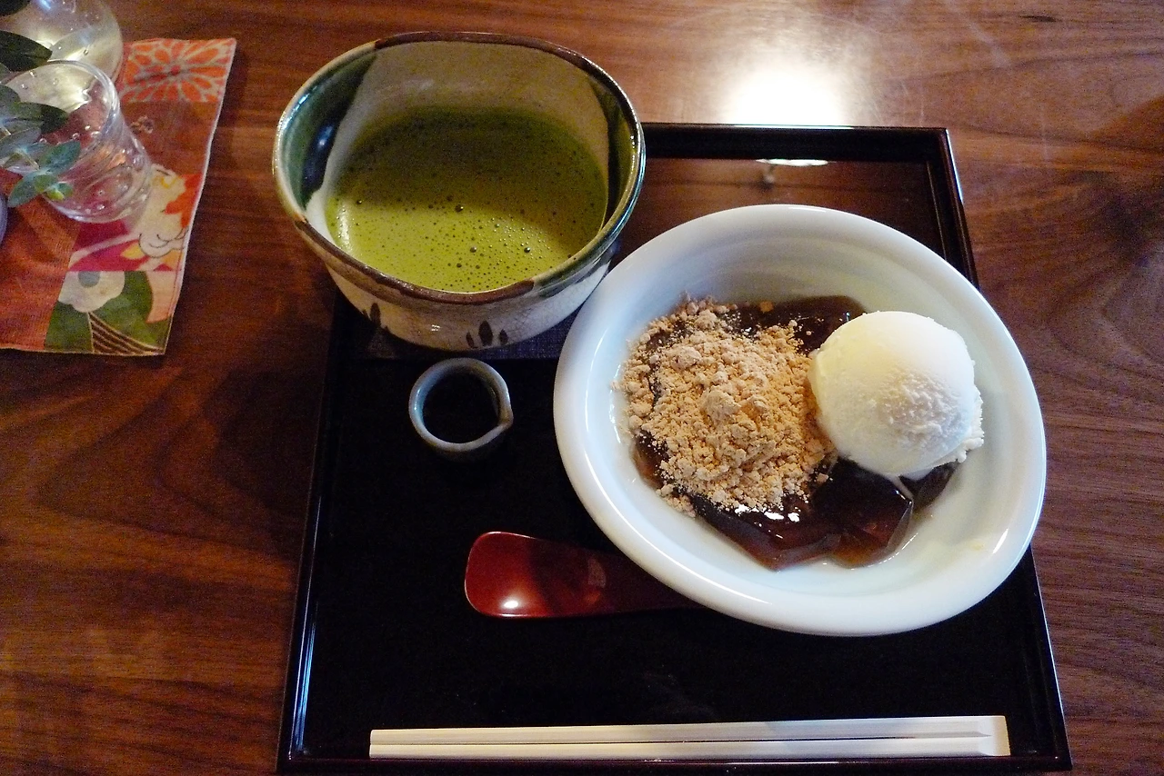 난 친절한 직원의 추천을 받아 그곳에서 인기 있다는 말차와 와라비모찌 세트를 주문했어.