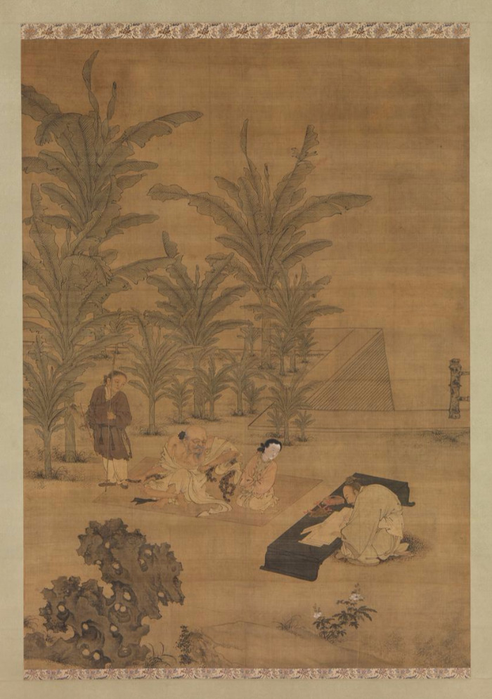 기이한 암석과 상서로워 보이는 나무와 식물들이 배경에 있고, 그의 가르침을 받아 적는 남자의 모습도 예사롭지 않다. 귀족인 것 같은데도 자신의 몸을 한껏 굽히고 낮춘 채 고명한 학자의 가르침을 받는 중이다.