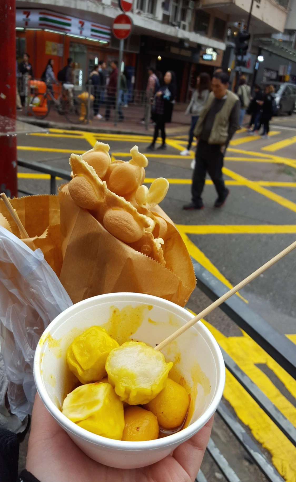 나에게 여행은 뭐니 뭐니 해도 먹거리 탐방이었기 때문에 S와 각종 기념품을 파는 몽콕 시장을 빠르게 지나치고 각종 길거리 음식을 맛보았다. 매콤한 어묵과 에그 와플이 맛났다. 에그 와플은 팥 없는 붕어빵 같은 맛일 거라고 예상했는데 더 달콤하고 자꾸만 손이 가는 맛이었다.