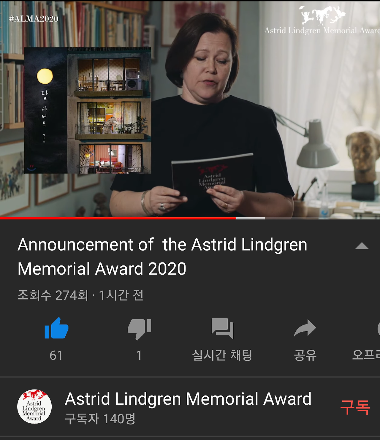 3월 31일에 발표된 기쁜 소식을 덧붙입니다. 백희나 작가가 한국 최초로 ‘2020 아스트리드 린드그렌상’ 을 수상했습니다! '아스트리드 린드그렌상'은 세계적인 아동문학가 린드그렌을 기념하여 스웨덴 정부에서 제정한 상으로, 아동문학 분야의 노벨상이라고 할 수 있는 권위 있는 상입니다. 작가가 세상에 내놓은 모든 작품에 대하여 수여하며, 어린이와 청소년의 독서 진흥에 기여하는 스토리텔러와 기관도 후보가 될 수 있습니다. 백희나 작가의 이름이 호명되는 짜릿한 순간(!)을 보고 싶은 분들을 위해 발표 영상 링크를 첨부합니다. 여기를 누르시면 확인하실 수 있어요.