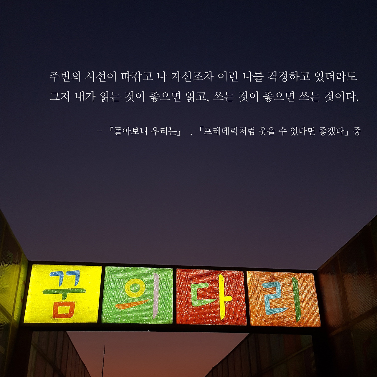 글을 쓰고, 디자인을 고민하고, 편집을 하며 밤을 새우는 날들이 많아졌다. 체력적으로 지칠 때도 있었지만 마음은 즐거웠다. 우리의 이야기를 오롯이 담은 작은 책 한 권을 곧 손에 쥘 수 있다는 기대감이 있었다. 준비하는 과정 자체가 즐겁기도 했다. 내가 좋아하는 친구들과 주기적으로 만나 글을 쓰고, 서로의 글을 읽어보고 이야기를 나누며(그리고 서로에 대해 좀 더 알아가며!), 인디자인 스터디를 하며 서투르지만 우리의 책을 직접 편집해나갔다. 마음이 맞는 친구들과 함께 한다는 것은 더없이 감사한 일이라는 걸 많이 느꼈다.