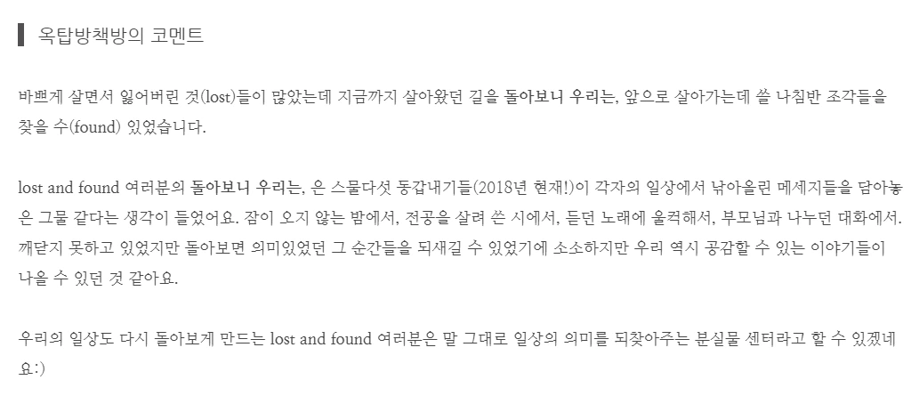 우리는 졸업을 앞둔 대학생으로서 막연한 불안감을 갖고 있지만, 우리만의 길을 찾을 것이라는 포부를 담아 팀명을 'lost and found'라고 정했고, 20대 초반으로서 느끼는 일상적인 이야기와 고민을 에세이집 『돌아보니 우리는』에 담았다. 사적인 이야기지만 우리만의 기록으로만 남지 않길 간절히 바라면서. 우리 또래가 읽으면 무언가 연결고리를 느끼길 바라는 마음으로 함께 '잃어버리고 얻은 것'에 대해 생각해보자고 말을 건네는 책을 만들고 싶었다.