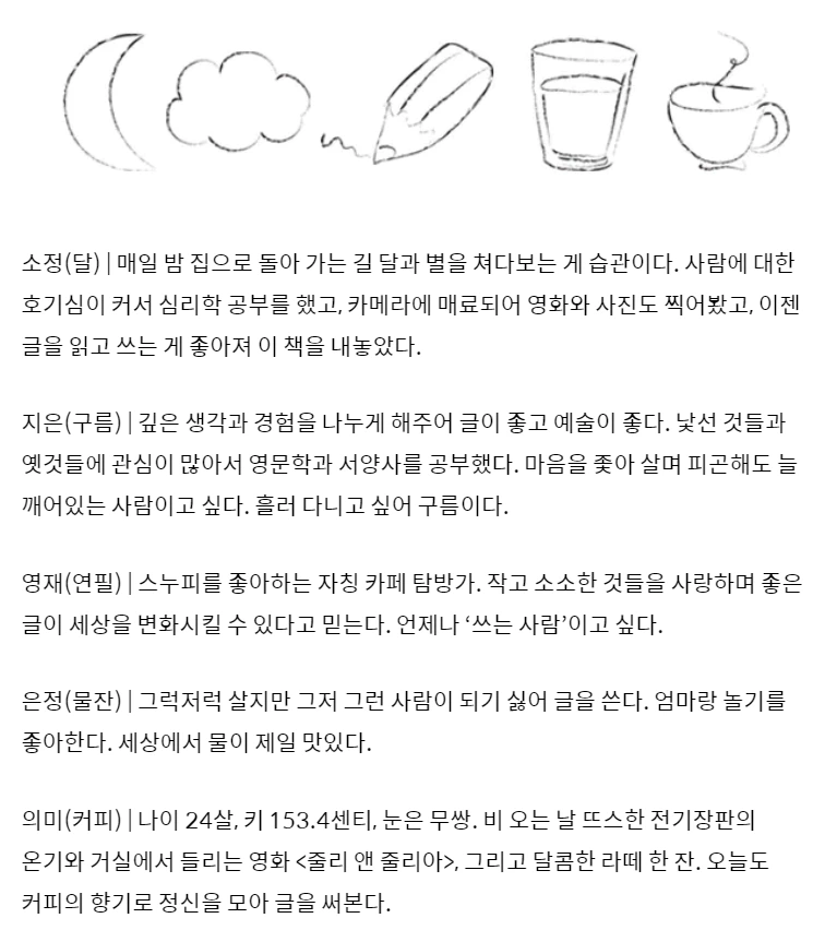 글 쓰고 읽는 것을 좋아하는 공통된 마음과 조금씩 다른 5가지 관심사와 재능을 발휘하여 한바탕 즐거운 작당을 벌였다. 사진을 좋아하는 친구는 책 사진을 예쁘게 찍어주었고, 포토샵 능력자인 친구는 홍보에 필요한 이미지와 표지를 멋들어지게 만들어주었으며, 각자 집 근처 서점에 직접 입고하러 가며 수고를 덜었다.