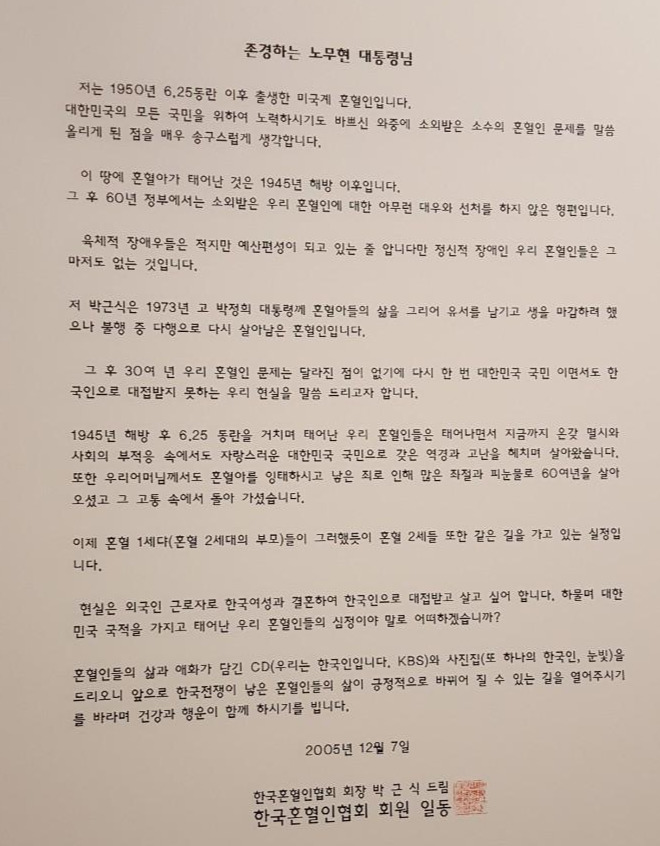 혼혈인의 존재와 아픔에 대해서 무지했던 나를 돌아보며 한없이 부끄러워지는 시간이었다. 맥락 없이 '기지촌 여성과 자녀'로 매도되며 냉담한 시선을 견뎌야 했을 혼혈인들을 생각하면 너무나 안타깝고 죄송스러운 마음뿐이다. 외모로 사람을 판단하고 차별하는 행태가 없어지기를. 아직 한국 사회에 잔존하는 순혈주의가 뿌리 뽑히기를. 6.25 전쟁의 상처로 계속 신음하고 있는 사람들에게 지속적인 관심을 갖고 부당하게 소외받는 사람이 없는 건강한 사회를 우리 함께 만들어 가기를 소망해본다.