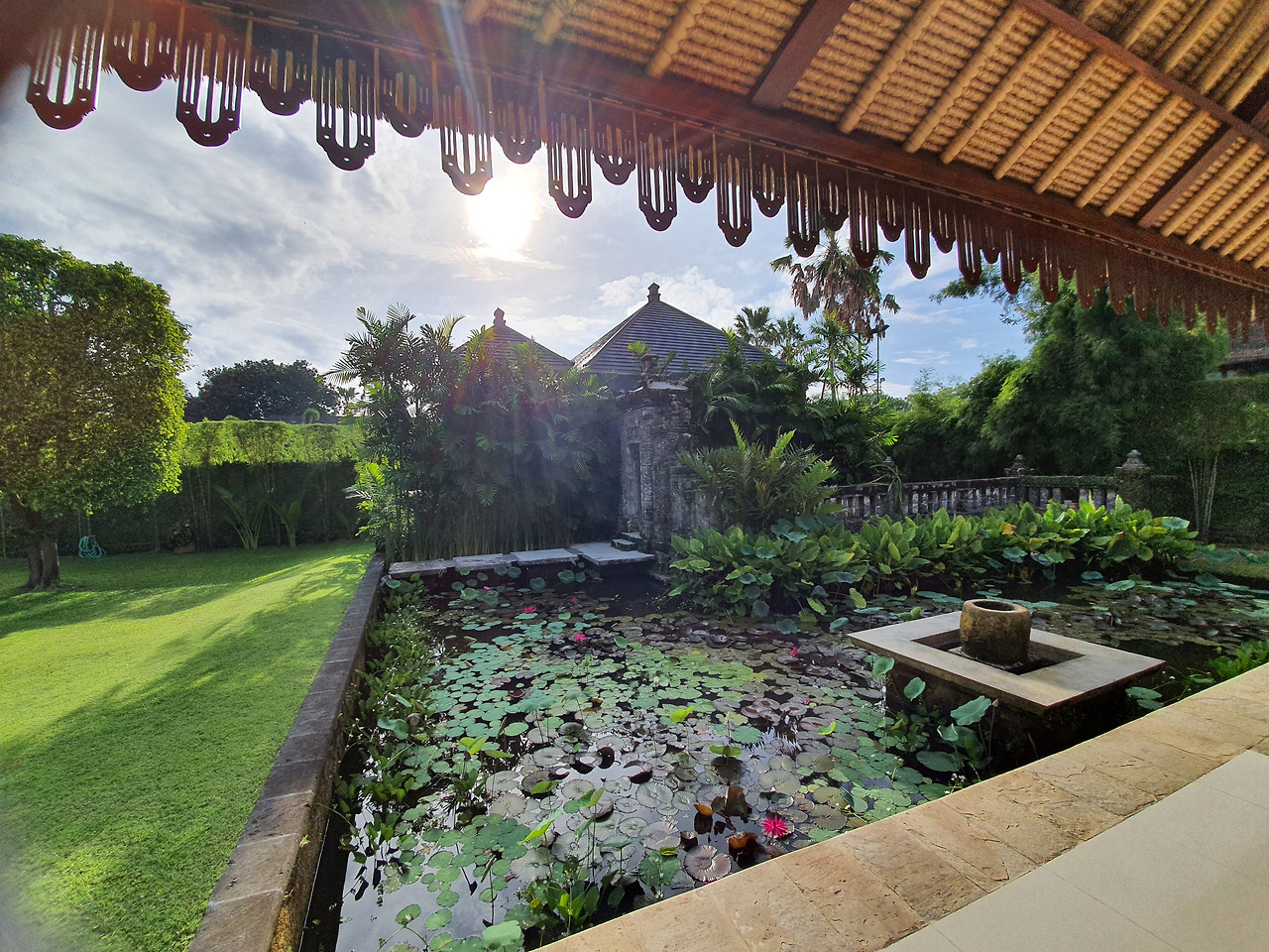 정원 뒤편에 작은 규모의 수영장이 있는데, 이용하는 사람이 없어 조용하고 깨끗하다. 아무도 없는 뒤뜰에서 우리 가족이 물놀이를 하며 소음을 만들었다. 선크림 대충 바르고 물속에 몇 번 들락날락했더니 금세 등이 빨갛게 화상을 입었다. 적도의 햇살을 너무 만만하게 봤던가보다.