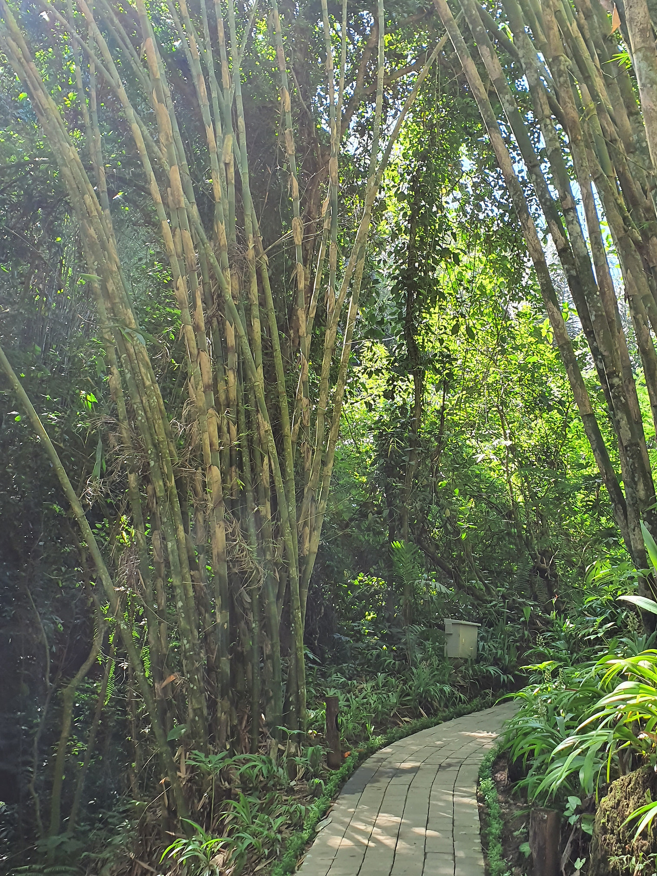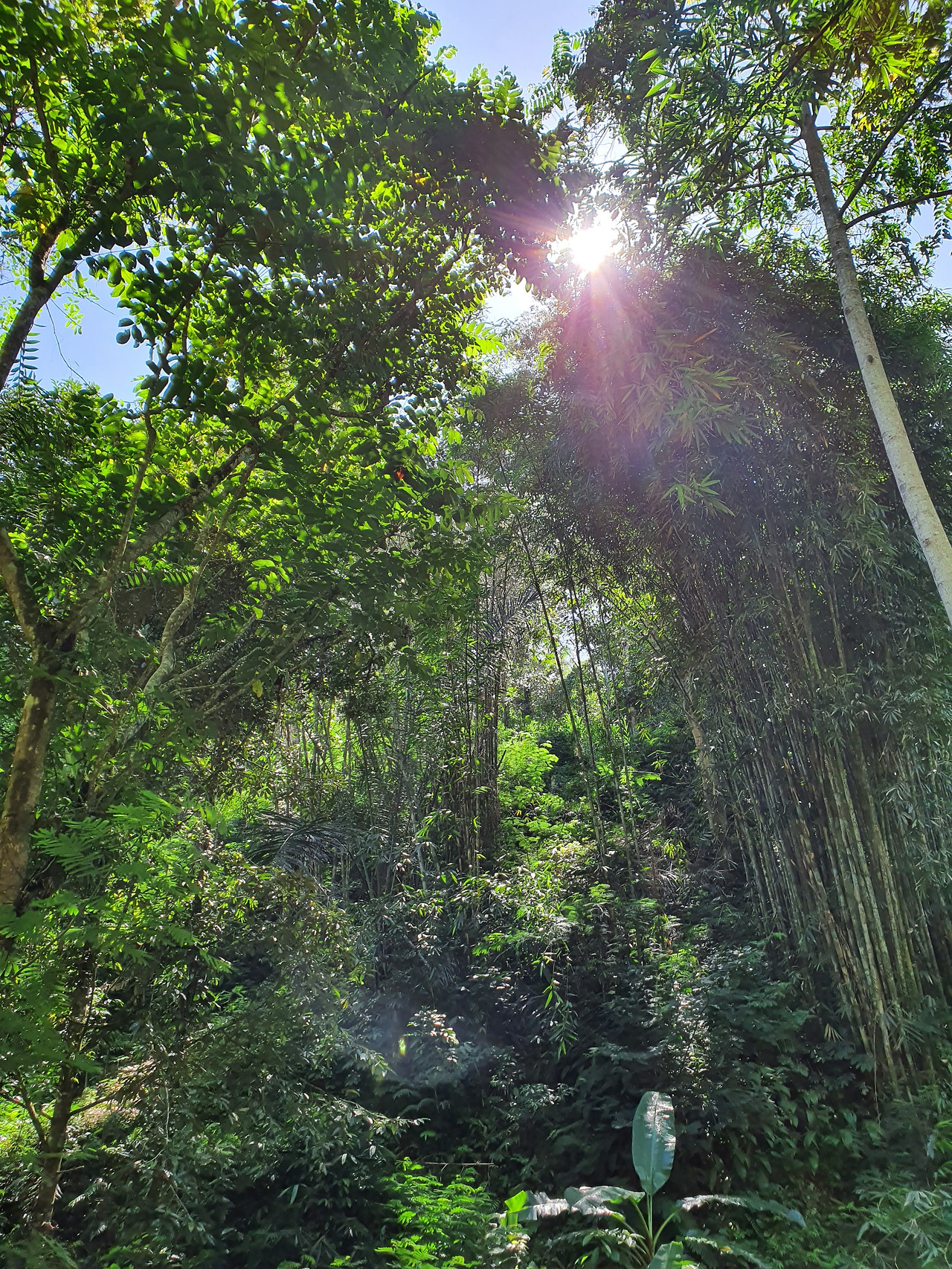 숙소 주변 트래킹 코스를 걸어 보았다. 코코넛 나무, 바나나 나무, 커피나무, 위로 자라는 나무, 옆으로 퍼진 나무... 이름 모를 꽃과 나무를 지나 걸어가면 생각지도 못한 대나무 숲이 나온다. 고개를 꺾어 쳐다봐야 끝이 보일 만큼 키 큰 대나무가 무더위 속에 시원한 그늘을 만들어주고 있다. 이 대나무를 잘라 계곡의 다리도 만들고 리조트 인테리어에도 사용하고 악기도 만드나 보다.