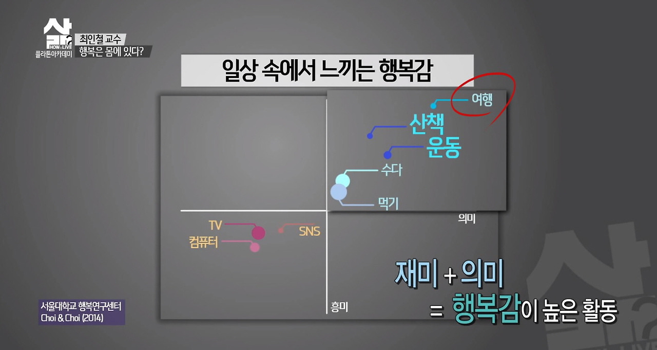 이제 구체적으로 이야기해볼까 하는데요. 아이와의 여행, 왜 필요할까요? 유튜브에 올라와 있는 수많은 강연 가운데 제가 인상 깊게 본 강연이 하나 있습니다. 바로 서울대학교 심리학과 최인철 교수의 강연입니다. ‘행복은 몸에 있다’라는 주제로 진행된 강연인데요. 이미 조회 수 60만을 넘어선 유명한 강연입니다. 이 강연에서 행복의 비법으로 꼽는 게 하나 있습니다. 그게 뭘까요? 바로 여행입니다. 서울대학교 행복연구센터에서 진행한 연구결과에 따르면 여행이 우리 일상에서 하는 활동 가운데 가장 압도적으로 행복감을 많이 주는 것으로 밝혀졌다고 하는데요. 여행이야말로 행복을 주는 최고의 활동이라고 소개합니다.