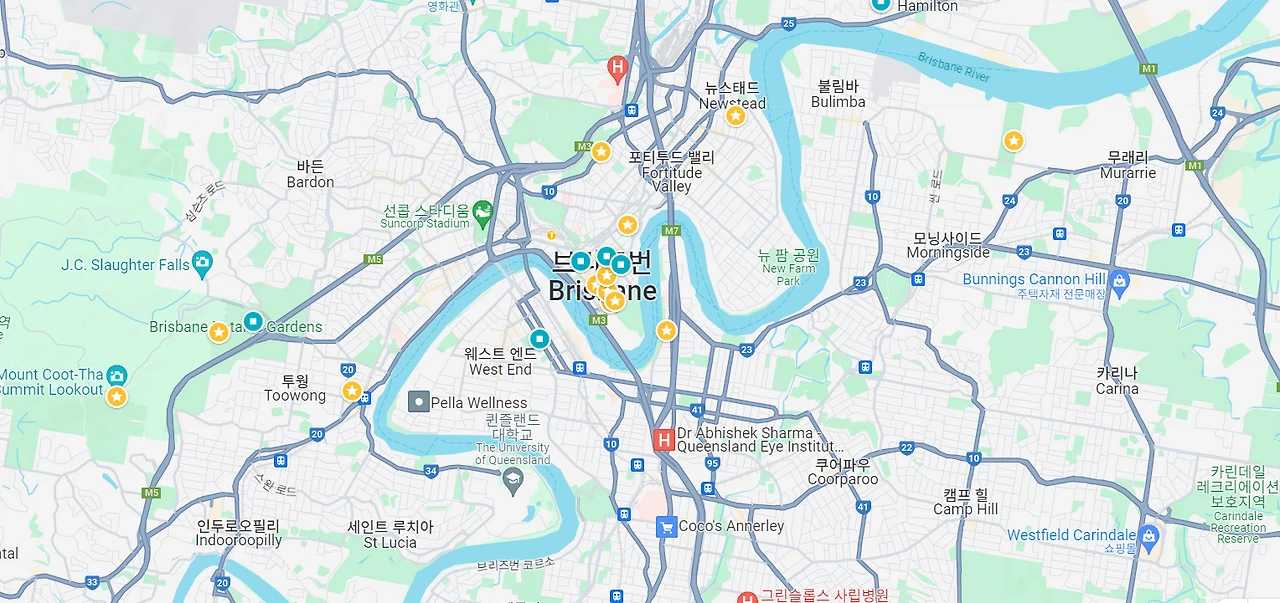 서울에 한강이 흐르듯 브리즈번을 가로지르는 부메랑 같은 강, 별표 많은 곳이 맛집 많은 시티다.
