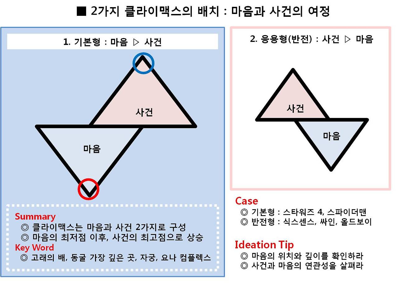 그런데 경우에 따라서는 그림 2. 응용형의 경우처럼, 마음 클라이맥스가 사건 해결 이후에 찾아오는 경우도 있다. 주로 반전을 다룬 이야기에서 자주 쓰이는 플롯이다. 사건이 무사히 해결된다. 세상은 원상태로 돌아갔고 질서가 찾아왔다. 그런데 해결된 사건을 통해 주인공은 뒤늦게 깨달음을 얻는 형식이다.