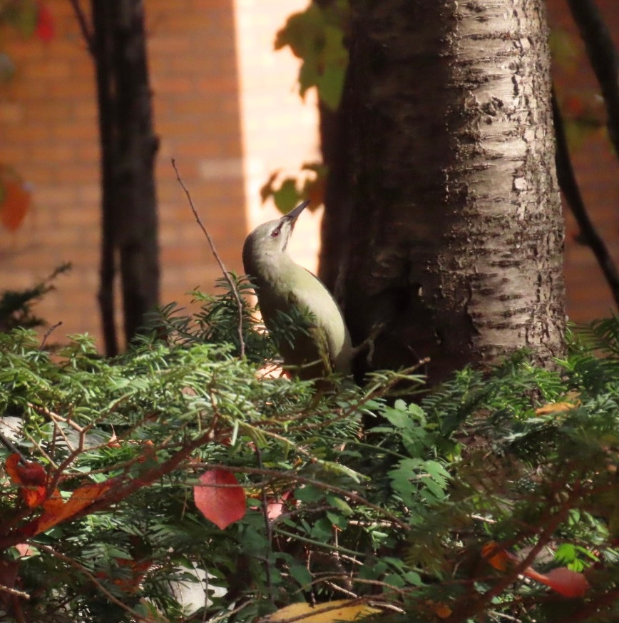 두 번째 청딱따구리. 딱따구리 편을 보셨나요. 날개가 올리브색이고 배와 얼굴은 회색입니다. 수컷은 머리에 빨간 점이 있고 암컷은 없습니다.