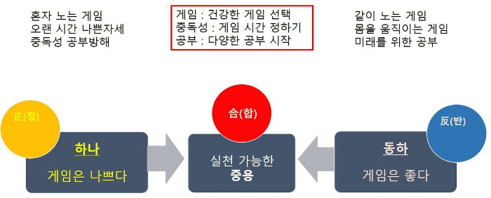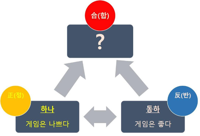 하나가 말했어요. "게임에는 좋은 점과 나쁜 점이 모두 있어. 그런데 서로 맞다고 반론과 반박을 하면 어떻게 될까?" 동하는 또 '어떻게 될까?'라고 따라 했어요. 하나가 말했어요. "우리는 편을 갈라서 싸우며, 정말 반대만 하자는 게 아니야. 바람직한 게임 생활을 찾아서 어떻게 실천하면 좋을지 답을 찾고 있는 거라고." 동하는 갑자기 '싸움'과 '정말 반대'라는 말에 변증법과 헤라클레이토스가 떠올랐어요. 뒤이어 실천이란 말에는 아리스토텔레스의 '실습 중인 용'이 떠올랐죠. 동하는 생각에 잠겼어요.