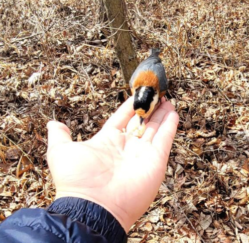산에서 곤줄박이가 보인다면 땅콩을 손에 올리고 핸드피딩을 시도해보자. 가벼운 새의 몸이 얼마나 경이로운지 느낄 수 있다.