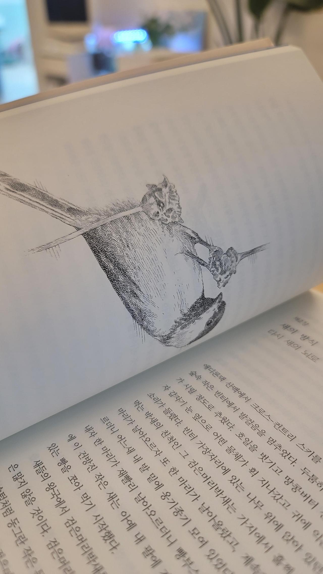 책에는 많지는 않지만 귀여운 새 삽화가 몇 개 있다.오랜 기간 새를 보아왔던 탐조가(birder) 입장에선 새들이 얼마나 똑똑하고 지혜로운 삶을 살아가는지 충분히 이해하고 있다. 하지만 동양이나 서양이나 새대가리(bird brain)란 욕이 있는 걸 보면, 날기 위해 가볍게 진화하느라 작은 머리를 갖게 된 새를 얼마나 오해해 왔는지 알법도 하다. 또 굳이 놀리려는 의도는 없이, 머리가 작은 사람을 '조두'라고 부르는 경우도 있다. 슬프게도 나는 한번도 들어본 적이 없다.