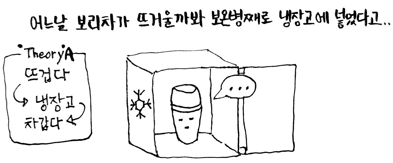 뜨거운 보리차가 담긴 보온병을 냉장고에 넣으면 차가워지는가? 이에 대해선 열역학 제2법칙과 엔트로피, 고립계에 대한 설명 등 여러 과학적 분석이 있을 수 있다... 고 잘난 척하려는 말을 참고 내가 물었다.