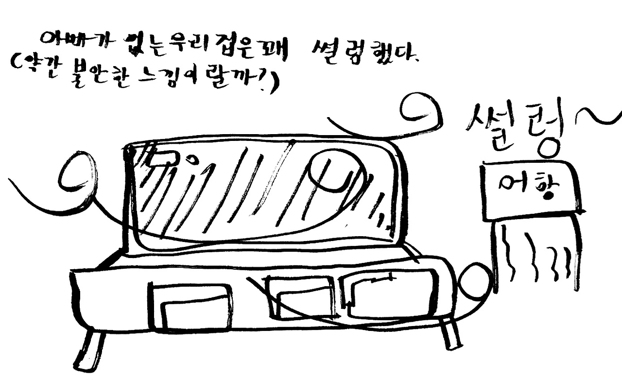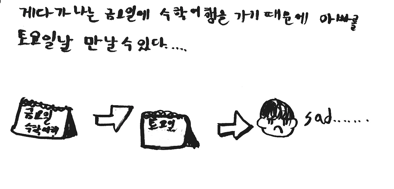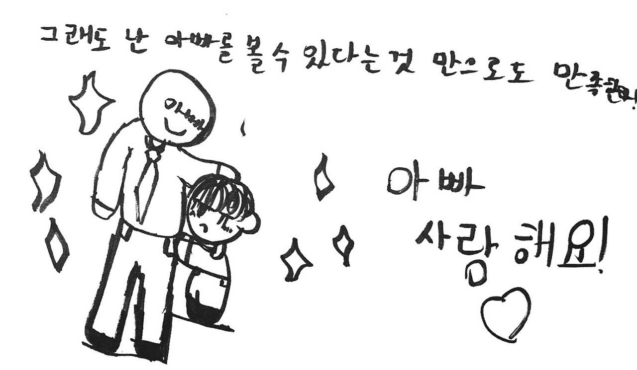 어제 쓴 일기대로 잠깐 출장을 나와있다. 밤이 되자 그림일기를 보내온 아들. 요즘은 컸다고 엄마나 아빠가 집을 비워도 의젓하게 혼자 잘 있으니, 아빠 기분 좋으라고 쓴 듯한데...