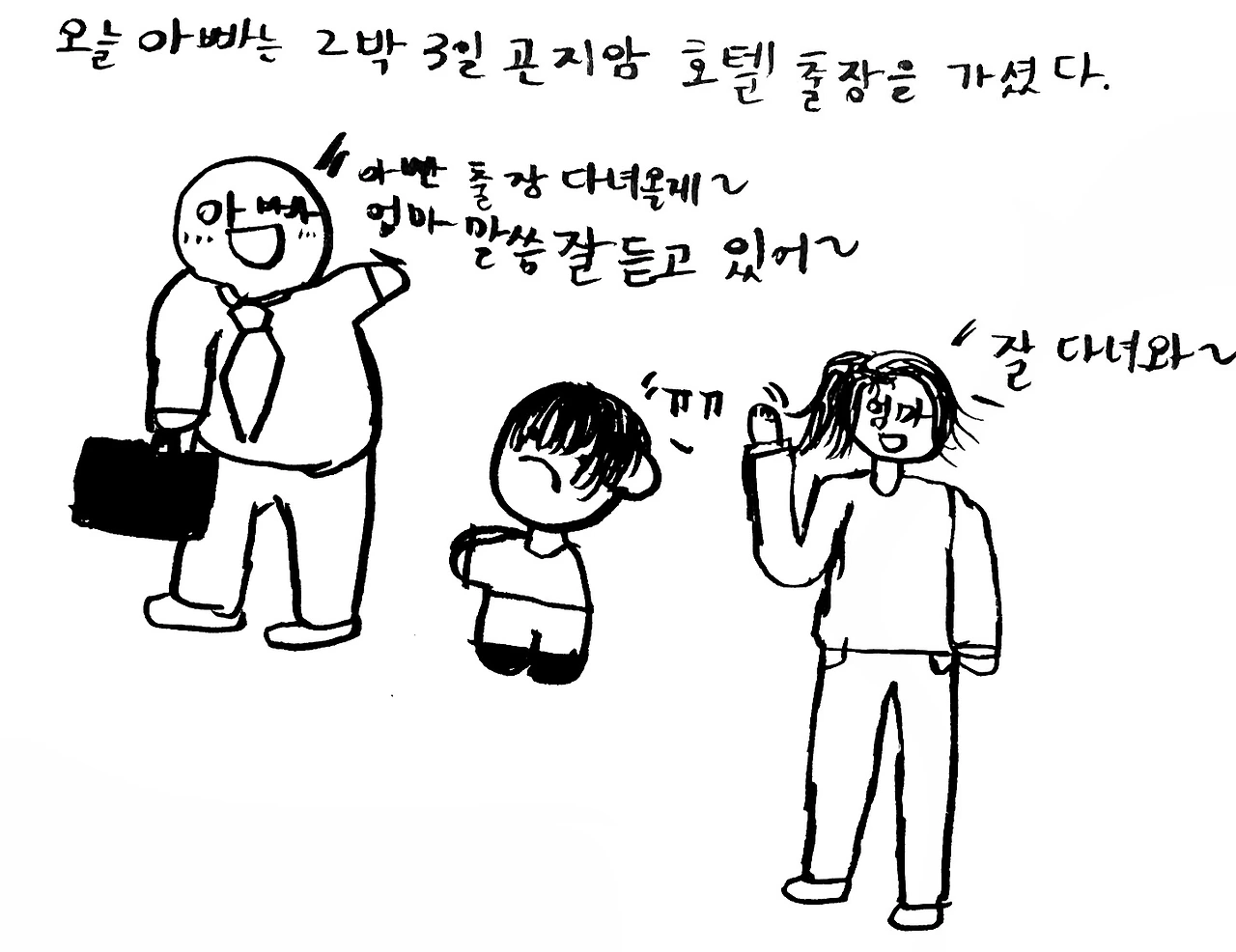 아빠 출장 땐 엄마의 지휘아래 정시 취침 정시 기상 모드로 생활하겠구나. 아들아.
