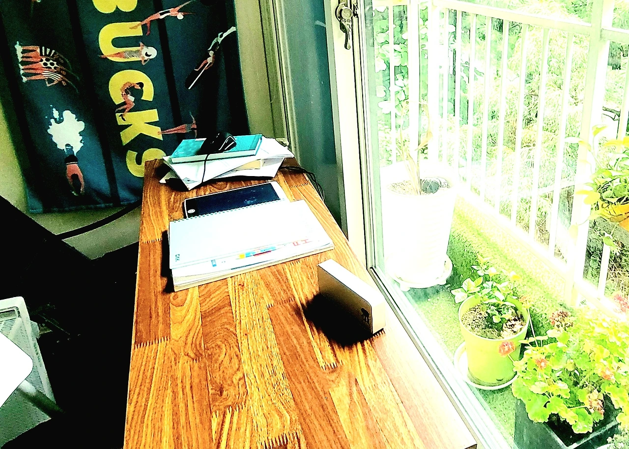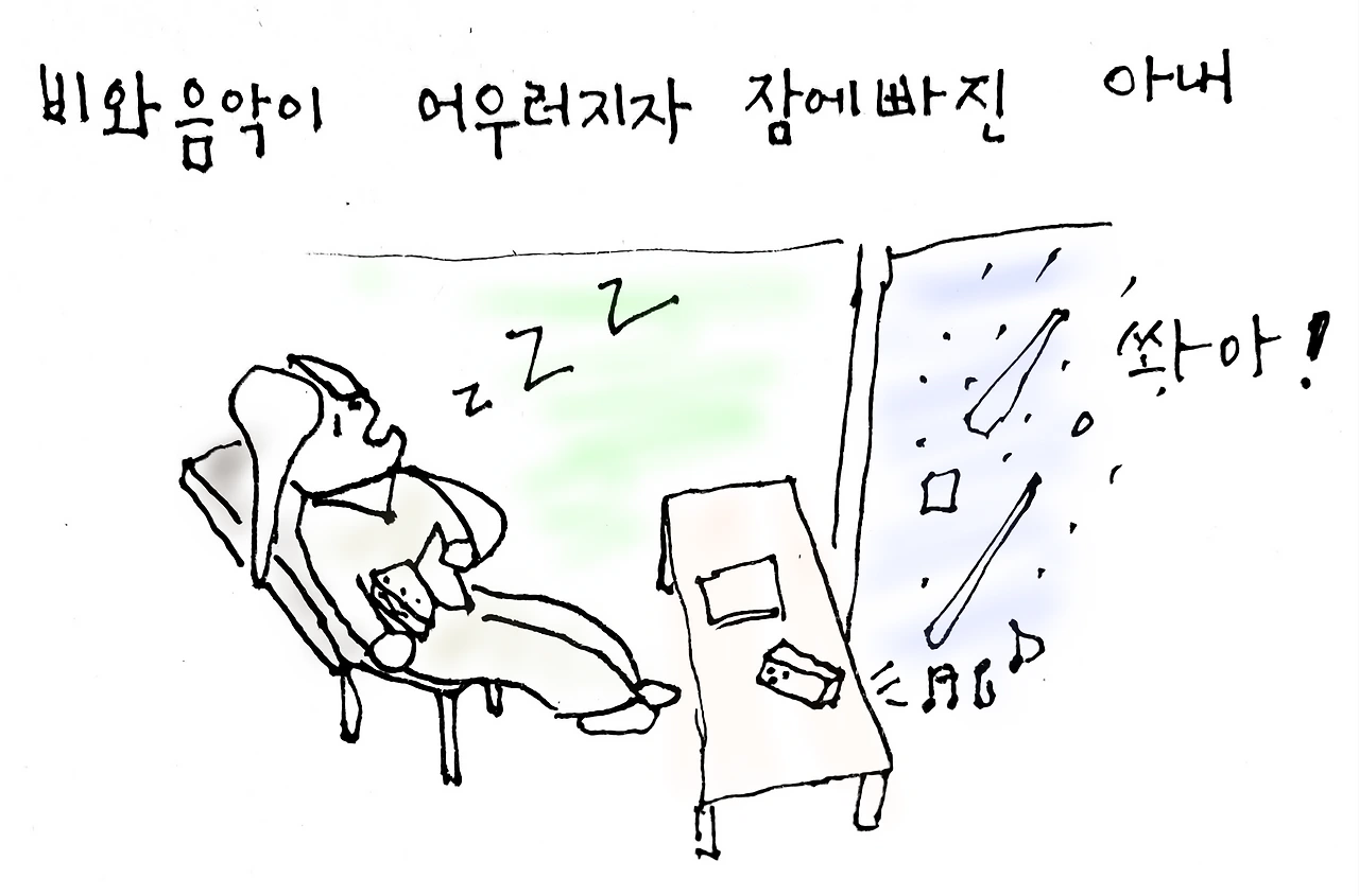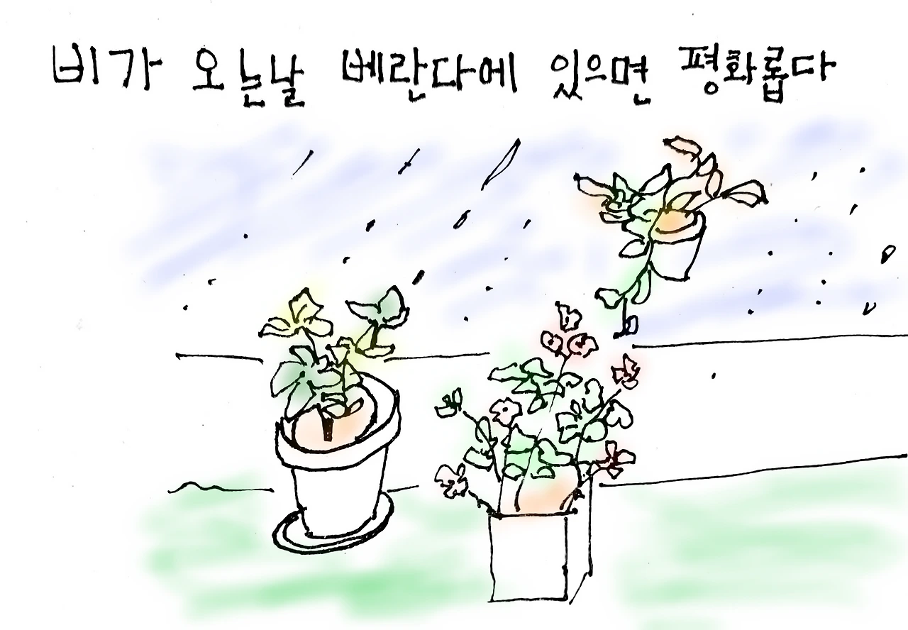 비 올 때 베란다에서 음악을 들으면 평화롭다.