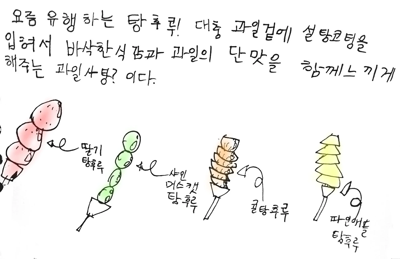 최근 탕후루가 유행인지 체인점이 많이 생겼다. 중국 연수 시절 가끔 먹던 간식이 우리나라에서도 유행하다니 신기하다.