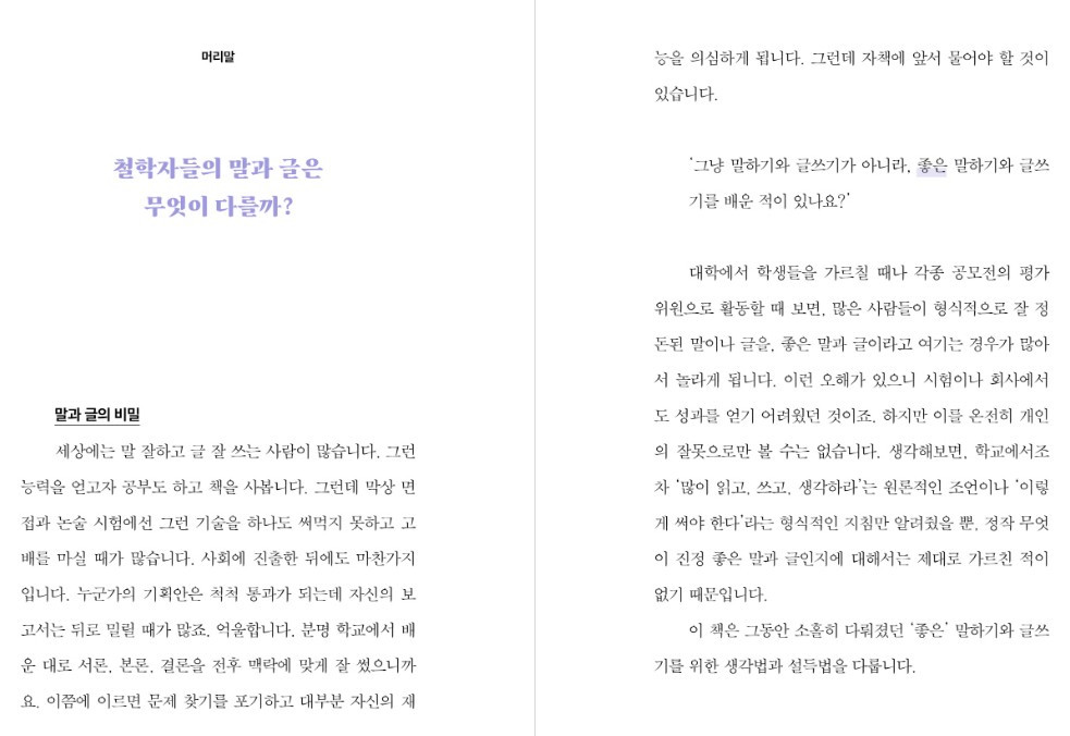 이것은 앞선 <철학자의 말하기 수업>에서도 마찬가지입니다. 초중고까지 최소 12년 이상 말하기와 글쓰기를 배웠는데 '왜 말하기 글쓰기에 서툴까?'란 궁금증은 독자와 공감대를 이루기 쉬운 질문인 것이죠.