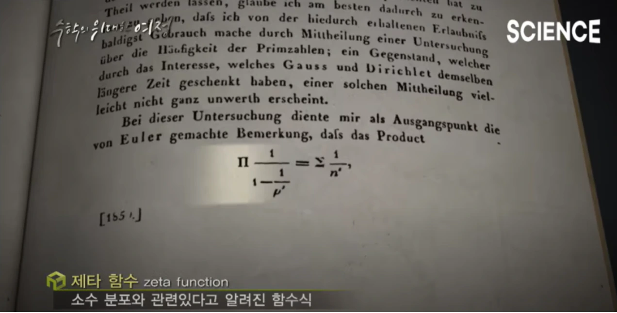 소수 연구의 흐름은 가우스가 교수로 있던 괴팅겐 대학에서 더욱 활발해집니다. 그중에서도 리만은 1859년, 베를린 아카데미에 기고한 단 한 편의 논문으로 소수 연구에 엄청난 파장을 일으킵니다. 리만은 스승인 가우스의 소수 추측에서 출발해, "제타함수"라는 새로운 틀을 제시합니다. 이 제타함수는 모든 소수를 '곱'의 형태로 포함하고 있다는 점에서 혁신적이었는데요. 더 놀라운 사실은, 이 함수로부터 "원주율 파이(π)가 나타난다는 점이었습니다. 규칙 없어 보이는 소수들이 어떻게 완벽한 도형 '원'의 상징인 파이와 이어지는지, 이는 지금도 큰 미스터리로 남아 있습니다.