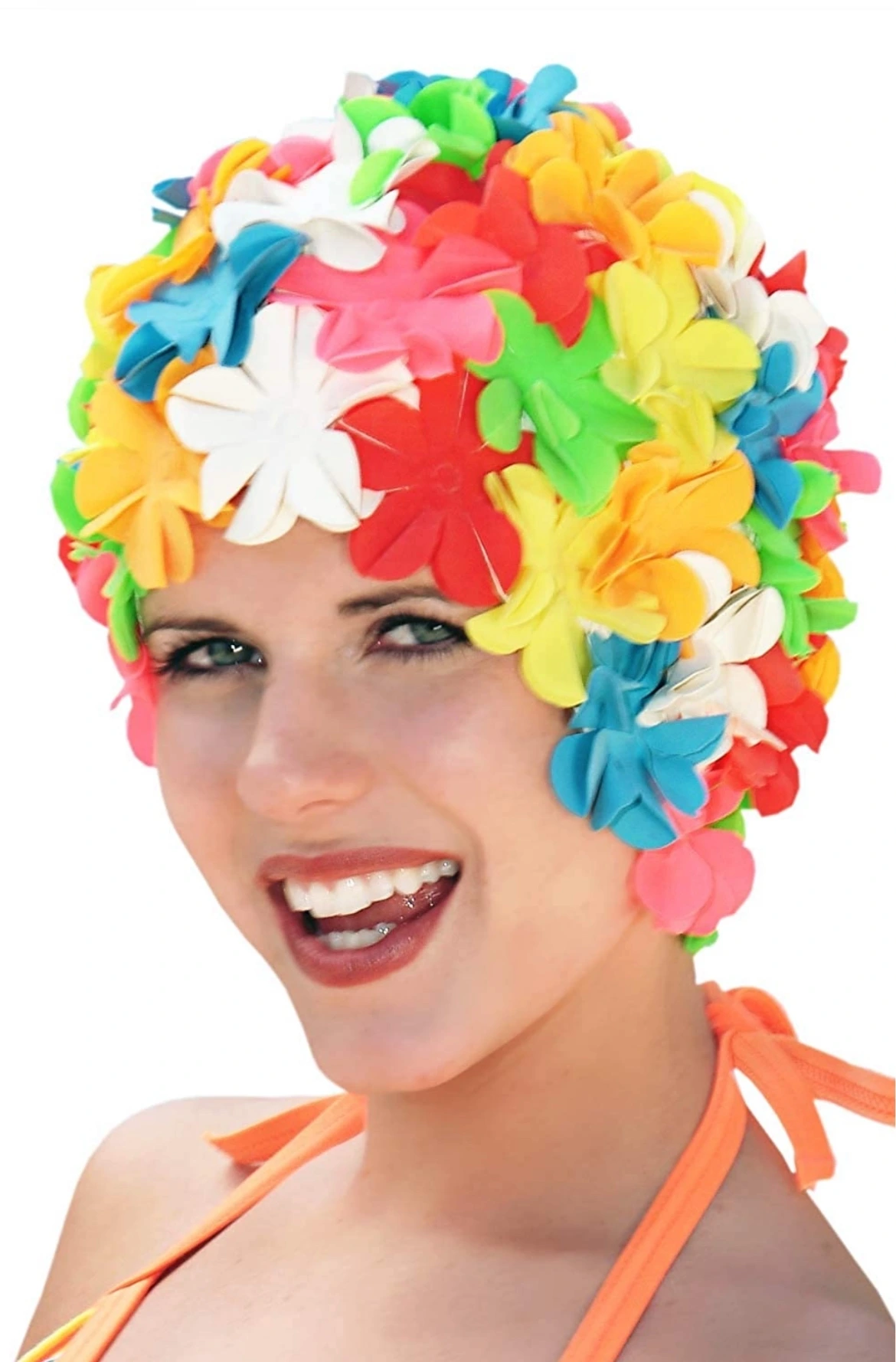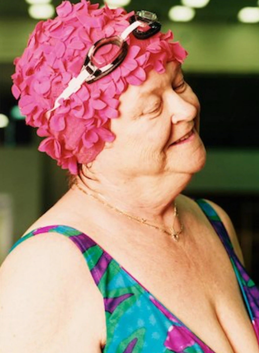 그렇게 수압의 고통에 희열을 느끼며 변태처럼 야외 풀장에 서 있는데 어떤 할머니 이용객의 예쁜 꽃 수영모에 눈길이 갔다. 꽃이 그려져 있거나 몇 개 달린 정도가 아니라 내가 어렸을 때 쓰던 것과 똑같은, 꽃이 주렁주렁 달린 빨간 수영모를 쓰고 한 할머니가 천천히 수영을 하는데 아직도 이런 수영모가 나온다는 게 너무 신기해서 한참을 쳐다보았다. 나중에 인터넷에 검색을 해 보니 복고풍이 유행하면서 '할머니 수영모 (old lady flower swim cap), ' '빈티지 수영모, ' '레트로 수영모, ' 이런 이름으로 다시 시장에 나와 팔리는 모양이다. 어쩌면 그 할머니는 새로 복고풍 수영모를 사서 쓴 게 아니라 한 30년 동안 깨끗하게 관리하면서 진짜 옛날 거를 쓰고 있는 걸 수도 있다. 독일인의 검소함과 '메이드 인 저머니' 물건의 견고함이 합쳐지면 그런 말도 안 되는 확률이 가능할 때가 있으니까.