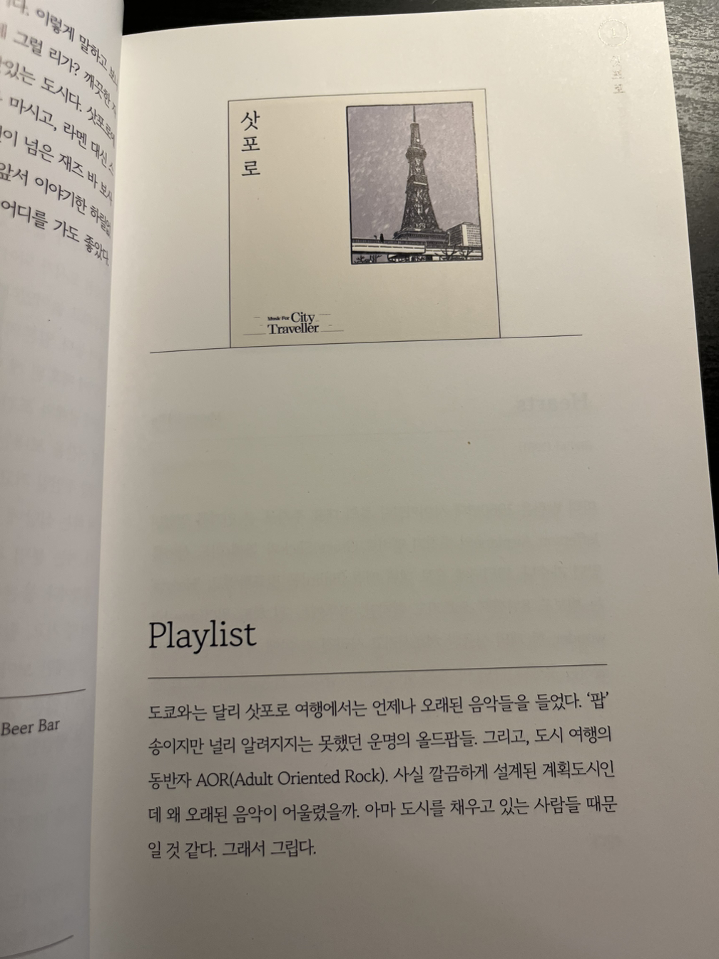 그렇게 이 책 'Music for City Traveller' (박정용 지음)를 쥐어 들고 서점 문을 나섰다. 지친 하루 끝에 매일 한 곡씩 저자로부터 선물을 받는 느낌으로, '하루에 하나씩 새로운 곡들을 (사실은 오랫동안 우리 곁에 있었지만 그저 내가 알지 못했기에 이제야 발견하는 노래들) 들어야지', 결심하고 한국에서 데려 왔는데 스위스로 돌아오고 바쁜 일상에 잠식되어 이 책을 사 온 사실조차 잊고 있었다. 그러다가 어제 처음으로 책장을 펼쳐 삿포로 플레이리스트를 들었다.