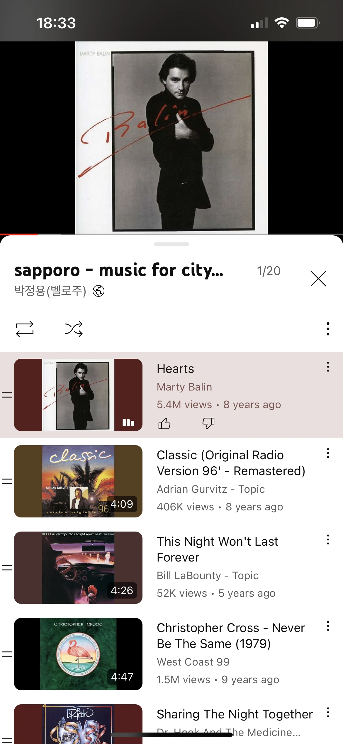 아, 나는 지금 여기 전기장판을 틀고 침대에 누워 있지만 블라인드가 쳐진 창문 바깥은 혹시 눈 내리는 삿포로가 아닐까? 오래되고 고즈넉하고 조용한 도시를 헤매는 방랑자의 겨울 노래가 여기 흐르고 있구나. Hearts (Marty Balin), Classic (Adrian Gurvitz), The Night Won't Last Forever (Bill Labounty), Never Be the Same (Christopher Cross), Love Will Conquer All (Lionel Richie), Love Will Conquer All, Love Will Conquer All, 그리고 또 Love Will Conquer All... 라이오넬 리치의 이 곡이 너무 좋아서 계속 반복해서 듣고 있다.