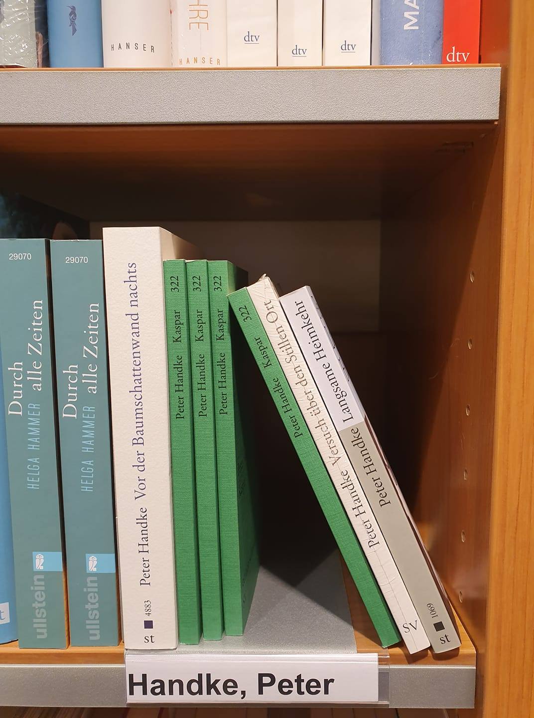 유모차를 끌고 2층에 올라갔다가 1층에 내려왔다가 구석구석을 다 살펴도 노벨 문학상 수상자 페터 한트케의 책을 찾을 수가 없었다. 한국이라면 벌써 부지런히 밤새 작가 얼굴이 인쇄된 "한국 문학 100년의 쾌거! 노벨문학상 바로 그 작가" 식의 현수막이 제작되고 그 현수막 밑에는 책들이 산더미처럼 쌓여 있어야 하는데 전혀 찾을 수가 없어서 결국 점원에게 물어봤다.