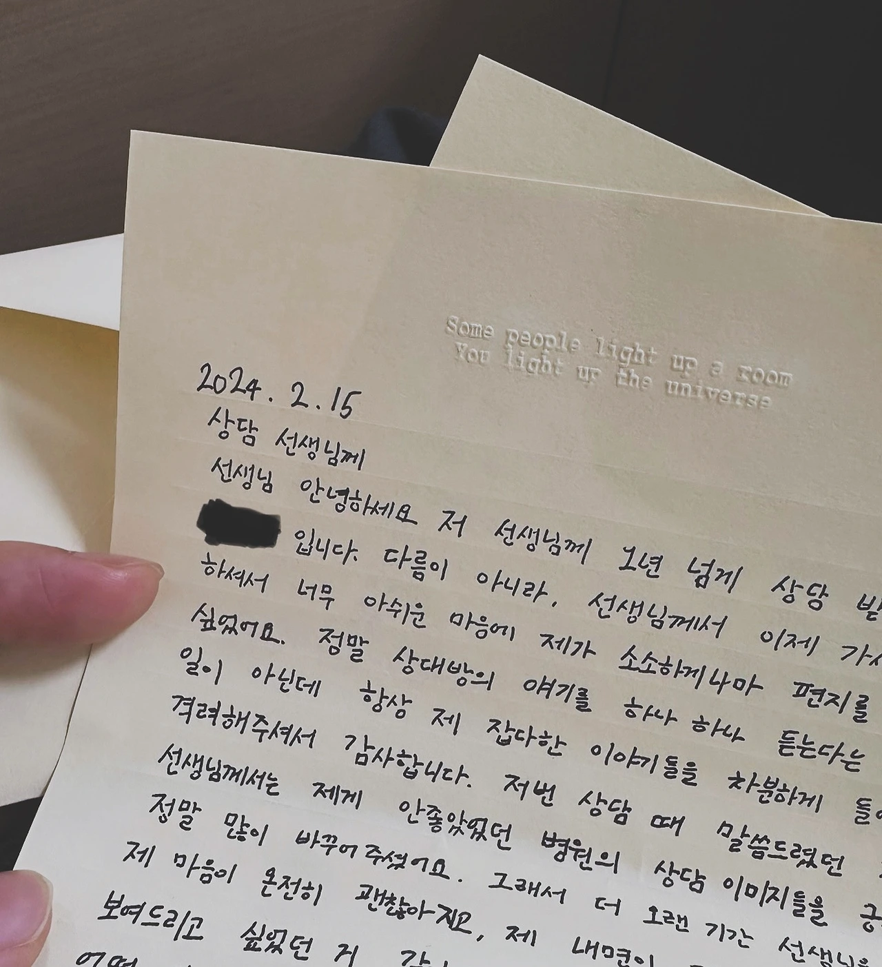 퇴사를 앞두고, 1년간 상담을 진행했던 내담자분께서 편지를 주셨다. 힘든 순간에도 다시 일어날 수 있을 것 같다고, 나아지는 과정을 지켜봐 주어서 고맙다고 말씀 해주셔서 감사했다.