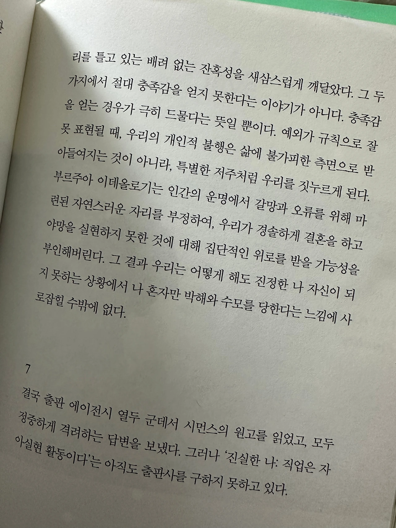 모두가 일과 사랑에서 행복을 발견할 수 있다는 너그러운 부르주아적 자신감 안에 은밀하게 똬리를 틀고 있는 배려 없는 잔혹성을 새삼스럽게 깨달았다. 그 두 가지에서 절대 충족감을 얻지 못한다는 이야기가 아니다. 충족감을 얻는 경우가 극히 드물다는 뜻일 뿐이다. 예외가 규칙으로 잘 못 표현될 때, 우리의 개인적 불행은 삶에 불가피한 측면으로 받아들여지는 것이 아니라, 특별한 저주처럼 우리를 짓누르게 된다. 부르주아 이데올로기는 인간의 운명에서 갈망과 오류를 위해 마련된 자연스러운 자리를 부정하여, 우리가 경솔하게 결혼을 하고 야망을 실현하지 못한 것에 대해 집단적인 위로를 받을 가능성을 부인해버린다. 그 결과 우리는 어떻게 해도 진정한 나 자신이 되지 못하는 상황에서 나 혼자만 박해와 수모를 당한다는 느낌에 사로잡힐 수밖에 없다.
