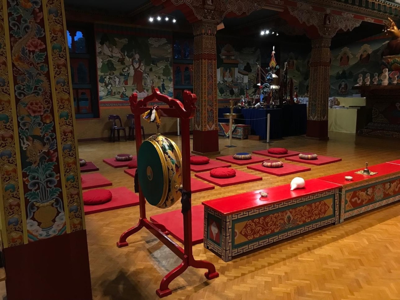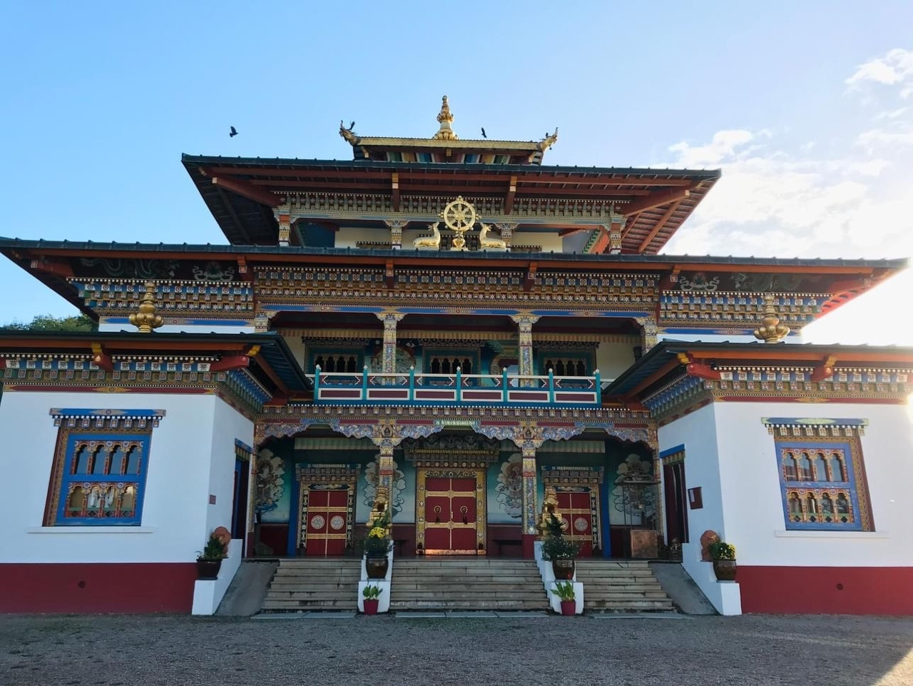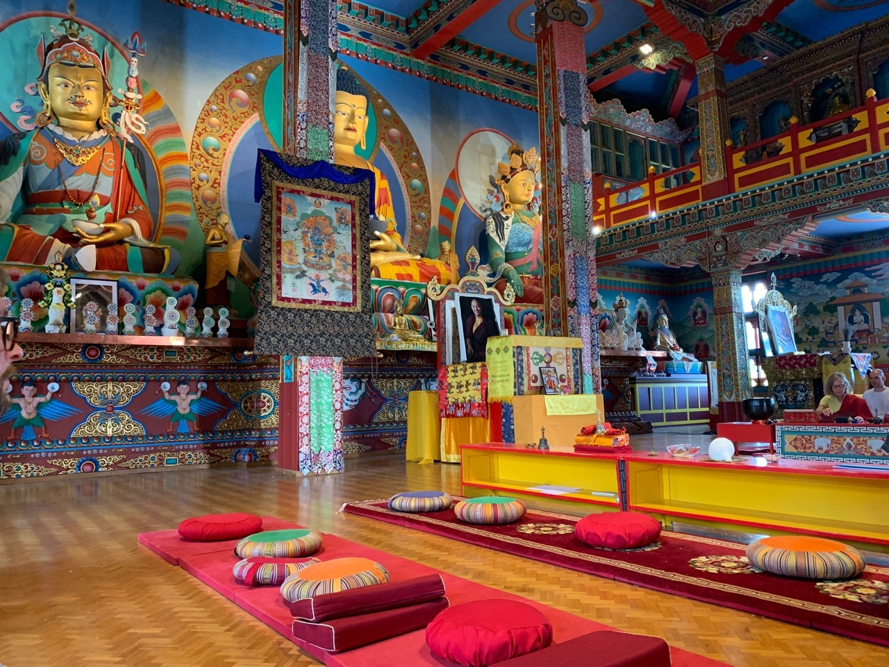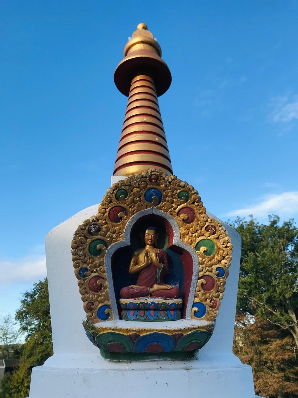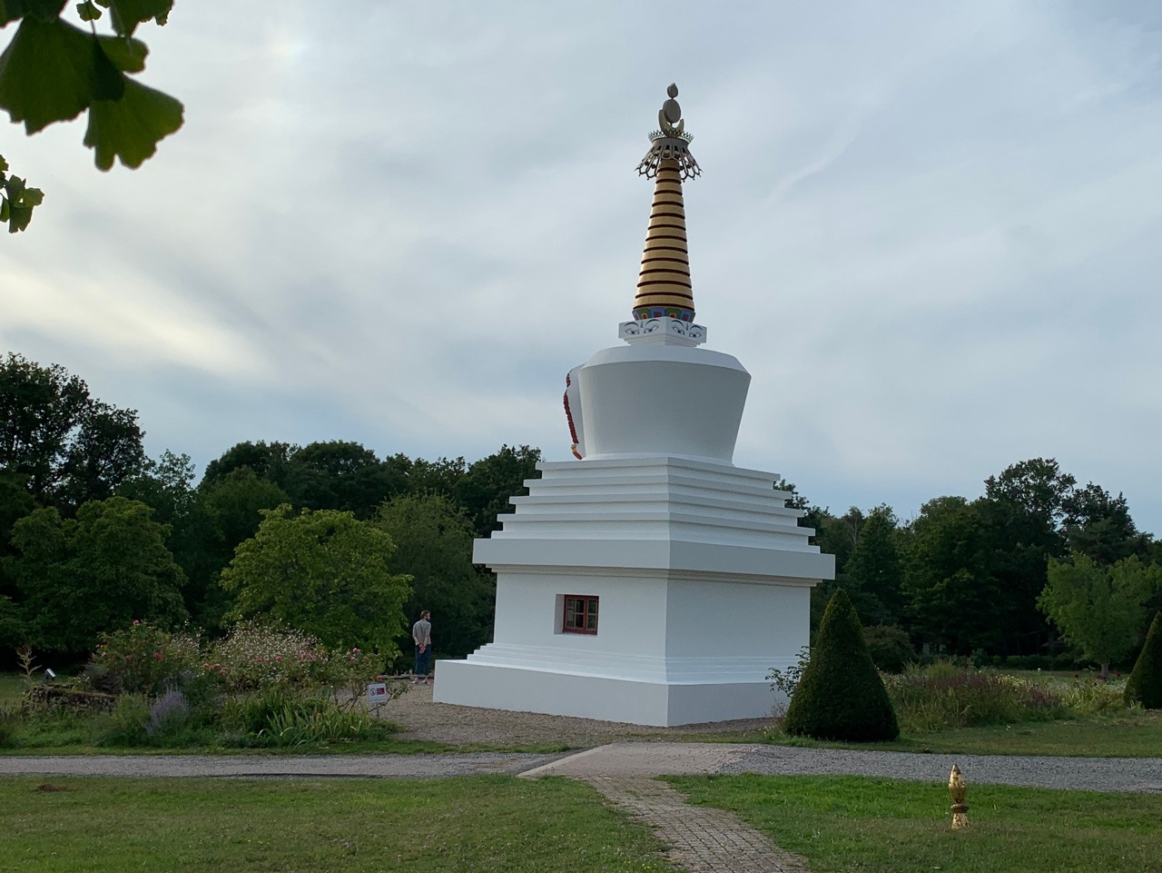 좌측의 대형 스투파는 1980년에 건립되었으며, 서양 최초로 지어진 스투파라고 한다. 정상에는 달과 태양, 정상의 보석을 상징하는 구조물로 장식되어 있는데, 달은 모든 고통의 소멸을, 태양은 천 개의 자비로운 빛의 광채를 상징하며, 왕관의 보석은 모든 소원의 성취를 상징한다.