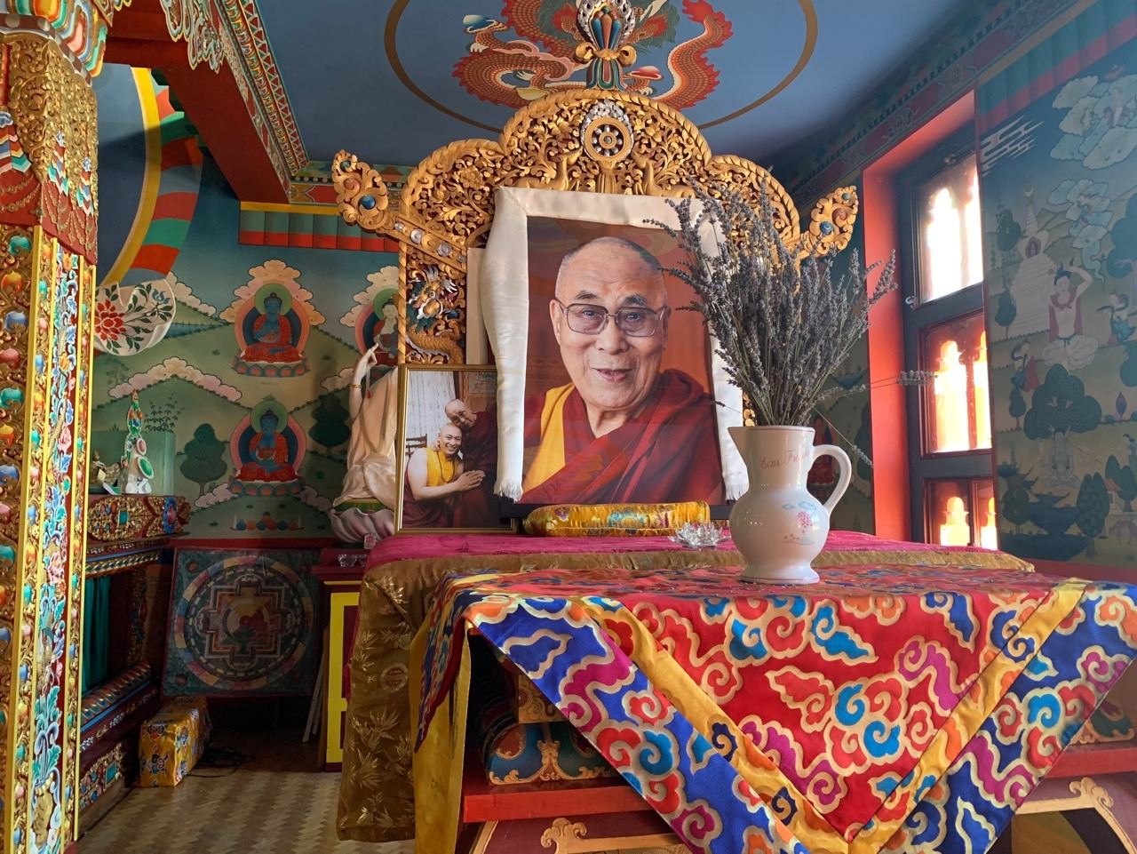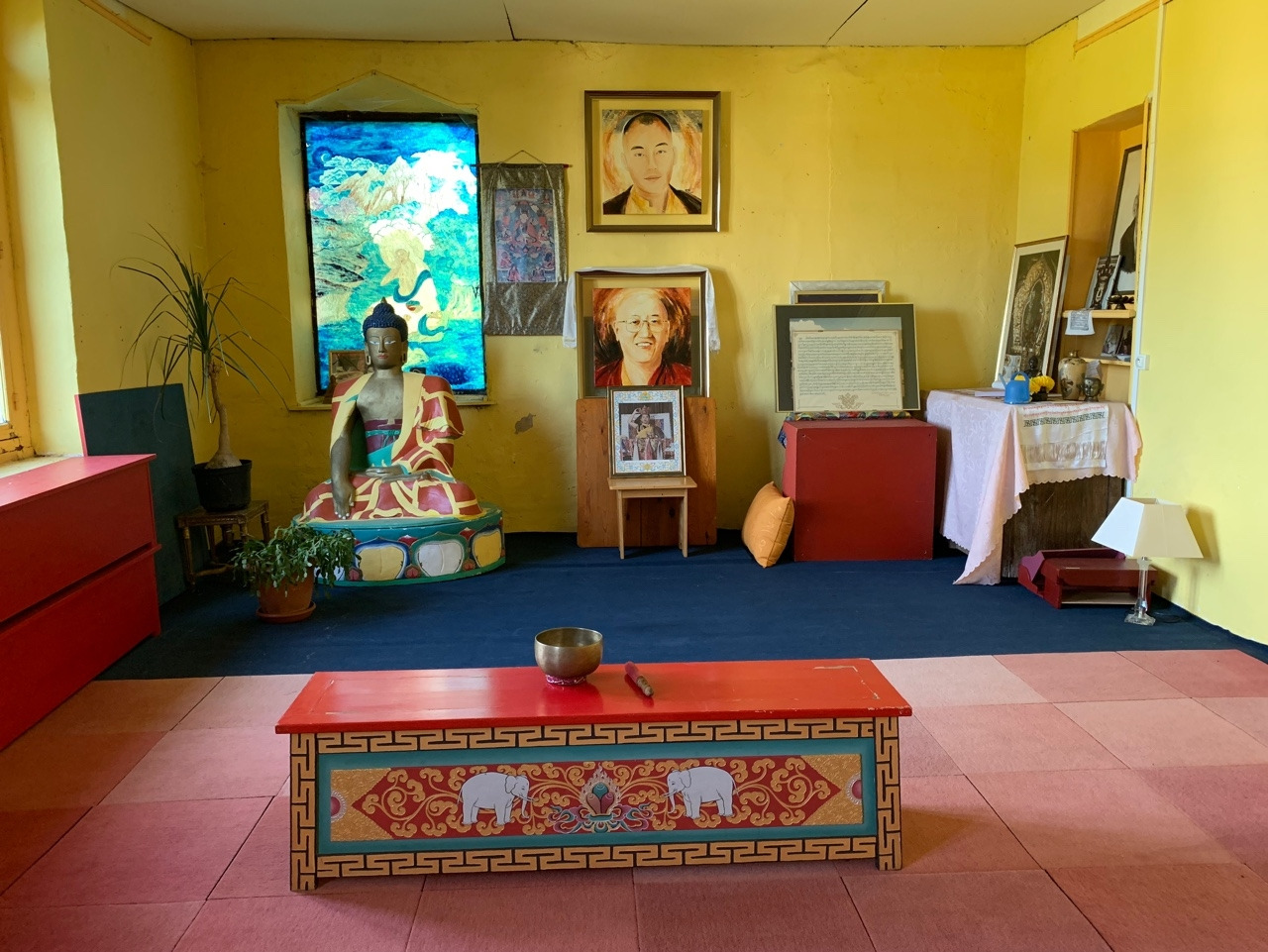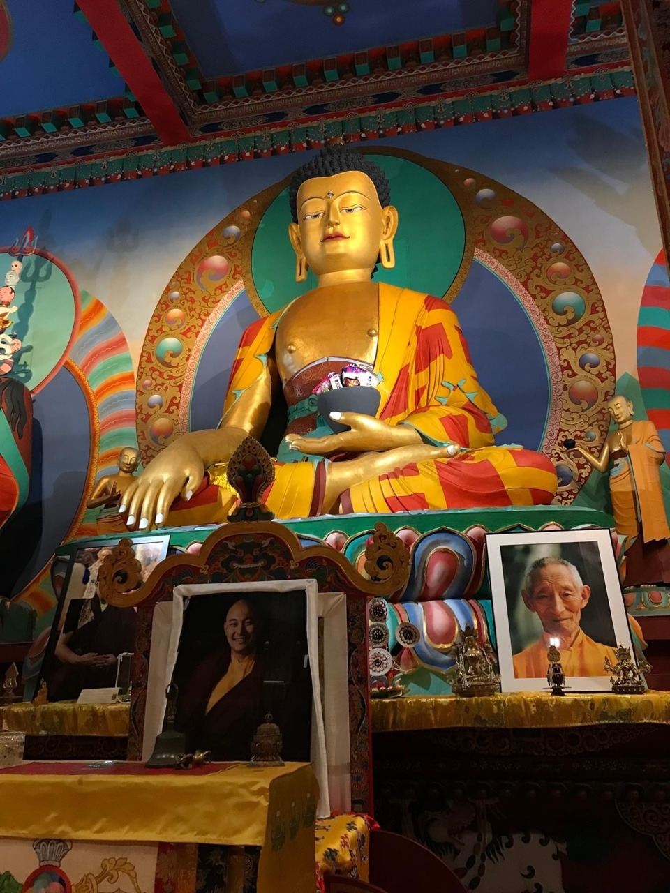 중앙에 자리하신 석가모니 부처님 앞에는 2대 까루 린포체 (Kalou Rinpoche)의 사진이 자리하고 있다. 이 장엄한 좌대는 불교 고승들이 대중들께 법문을 설하실 때 자리하시는 곳이다. 이는 성스러운 가르침을 의미하므로 법당에서 아주 중요한 위치를 차지한다.
