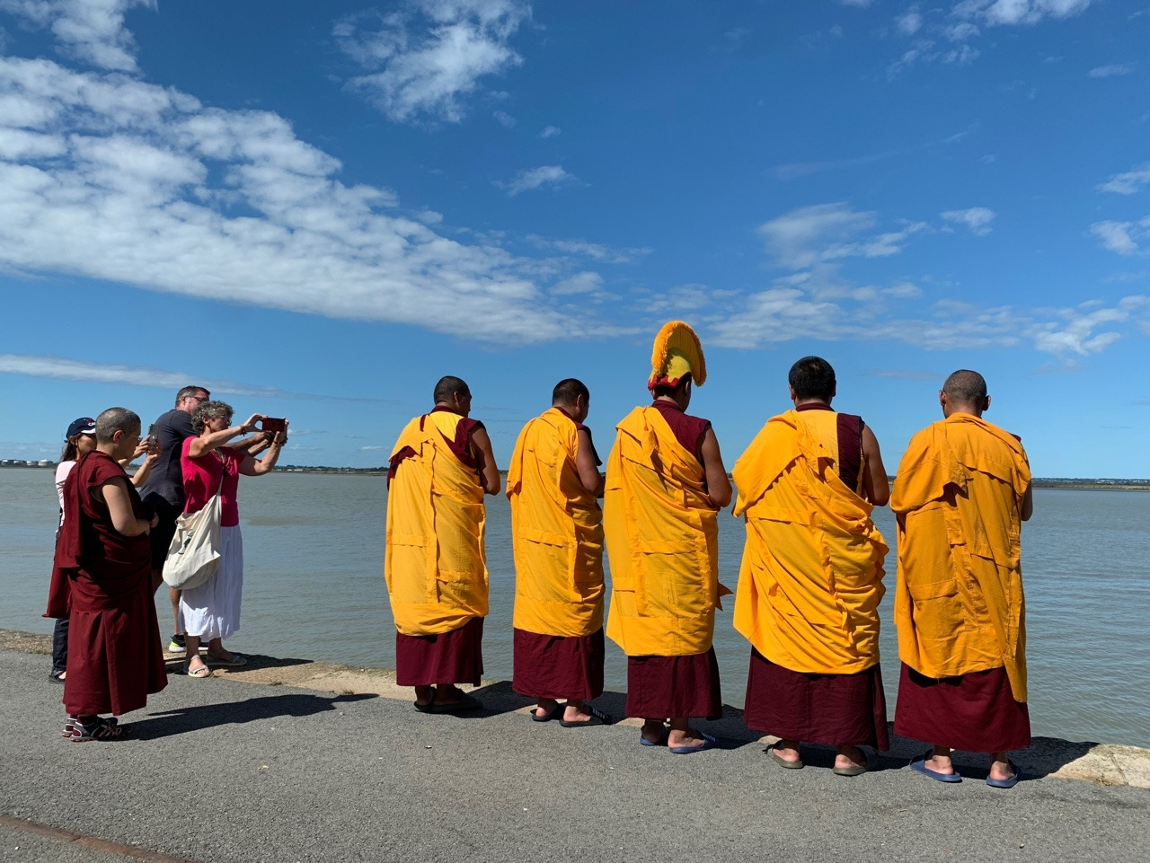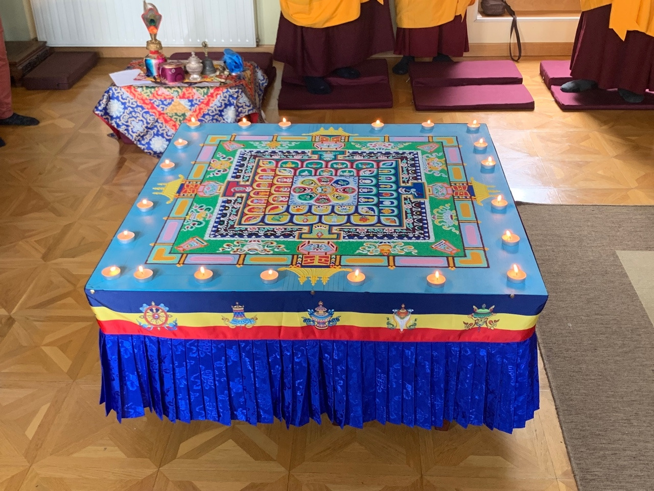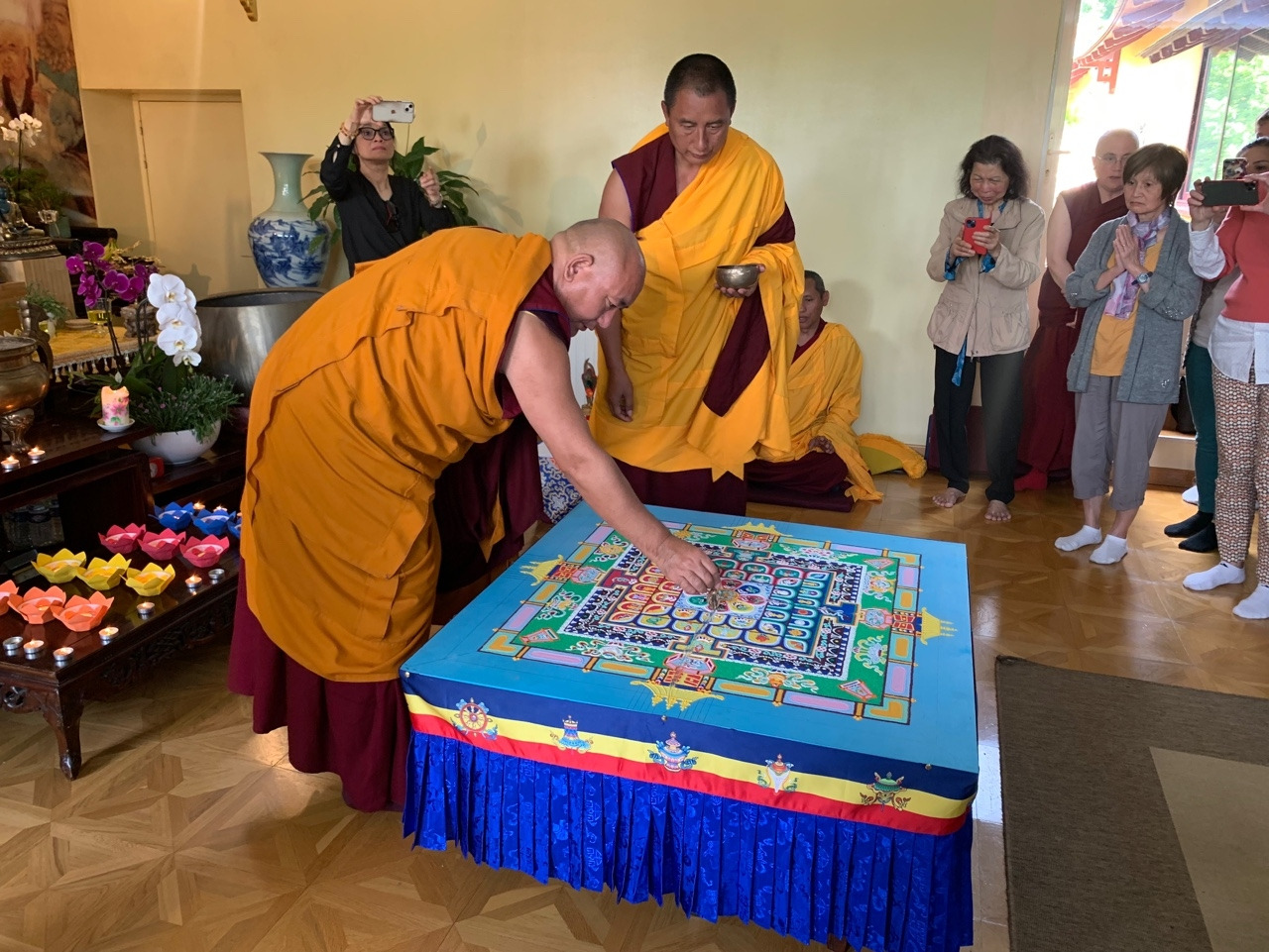 만다라가 완성되고, 해체 전 아봉 린포체와 만다라를 조성하신 세라메이 스님들 그리고 통역을 맡아주신 프랑소아즈 왕 (Françoise Wang)이 함께 이 소중한 시간을 사진으로 남긴다. 프랑소아즈는 저명한 프랑스인 티베트 불교학자로 내가 공부하고 있는 기관에서도 티베트어와 프랑스어 동시통역을 맡아 주시는데, 이번에도 감사하게 린포체 님과 개인 면담을 하는데 큰 도움을 주셨다.