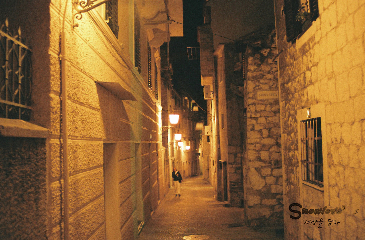해가 저물고 밤이 된 스플리트의 골목길. 좁은 골목길 사이를 이리저리 다니다 보면 어느새 나도 모르게 그 도시를 사랑하게 된다. 따뜻한 가로등이 우리를 환히 밝힌다.