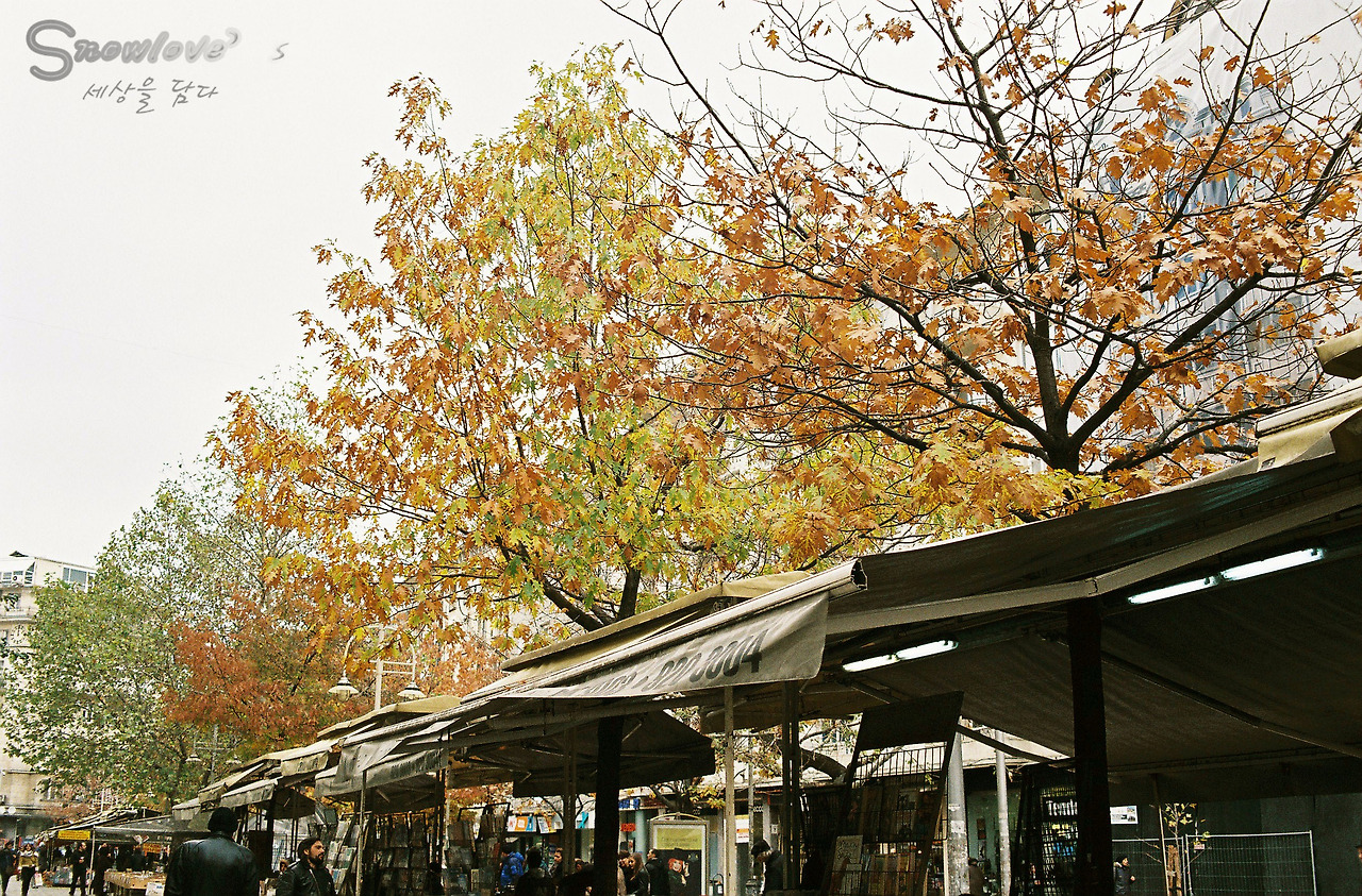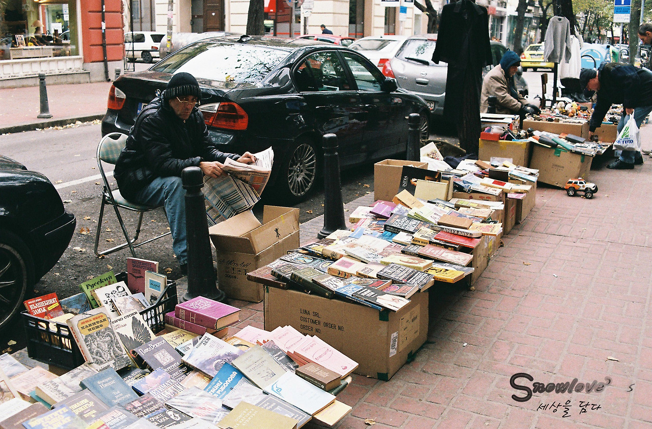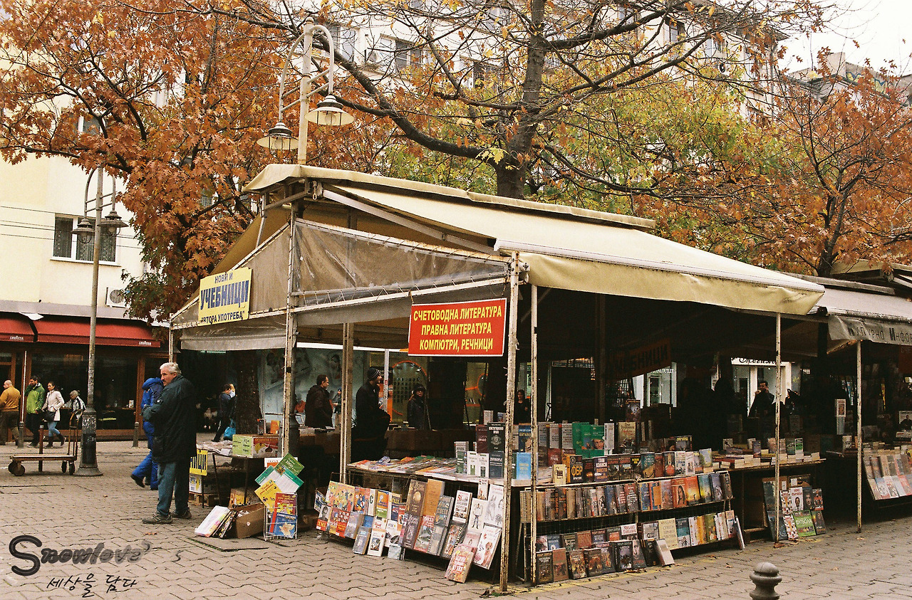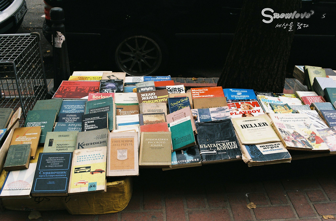 씻고 쉬다가 오후 시간이 되어서야 거리로 나왔다. 가을 옷만 가지고 왔는데 이곳의 사람들은 이미 초겨울 복장을 하고 있었다. 패딩에 털모자에. 나 혼자서 가을 옷을 입고 좋다고 돌아다녔다. 소피아는 이렇게 길에 헌책을 내놓고 파는 경우가 많았다. 읽지도 못하는 키릴 문자가 매력적으로 다가왔다.
