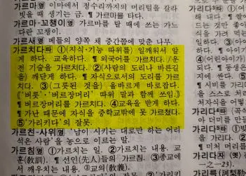 국어사전 열세 번째 페이지에서 선택한 단어는 "가르치다"이다. "가르치다"를 선택한 이유는 시대가 변함에 따라 좋은 의미로 바뀐 부분이 있으면서 동시에 요즘 제일 쓰기 어려운 말인 것 같아서 선택했다.