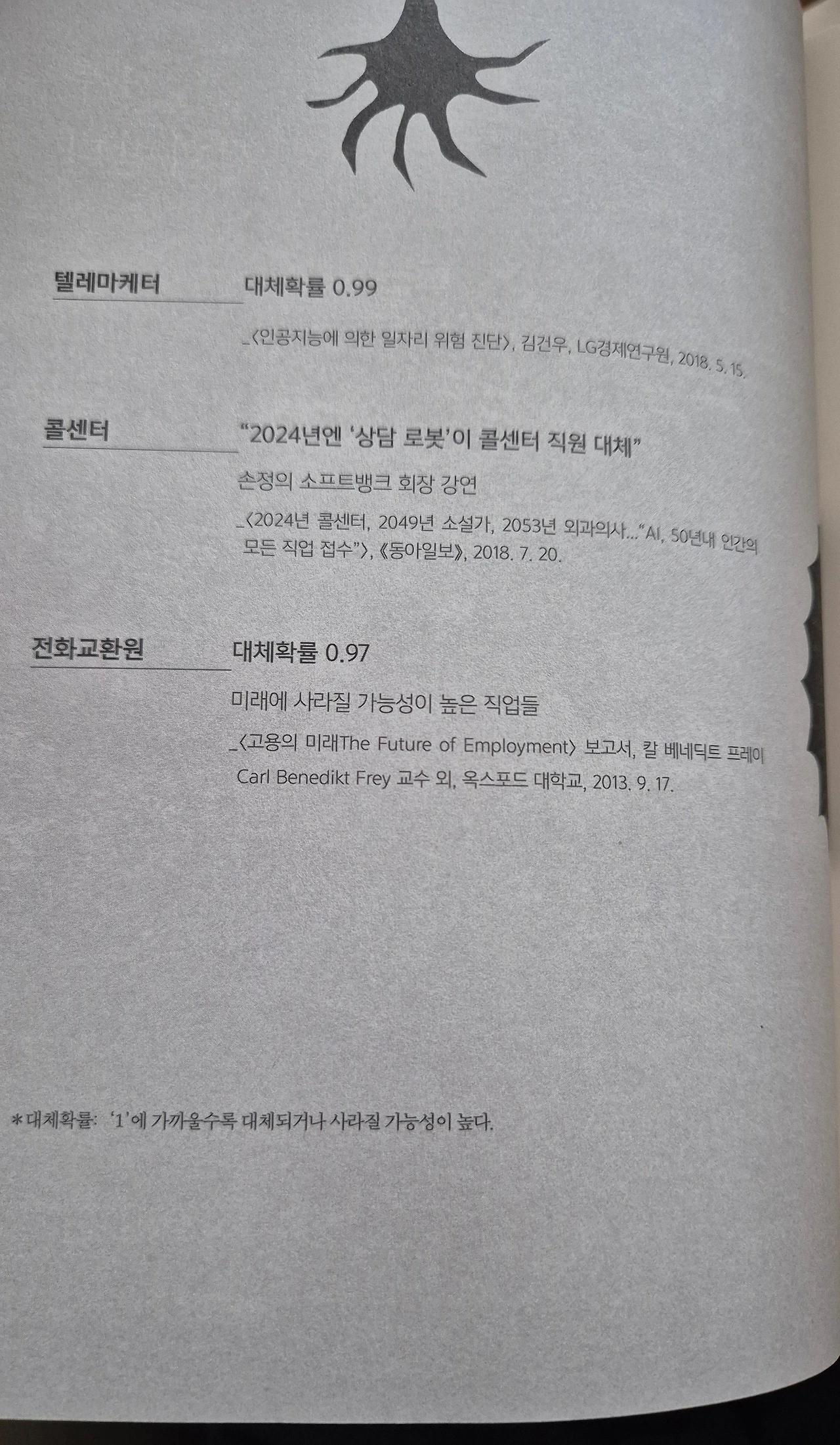 각 단원은 종말에 가까운 직업을 동사로 주제화하였고, 첫머리는 그 단원에 나오는 직업의 대체 확률을 적어놓는다.