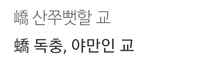 그런데 산쭈뻣할 교 嶠가 아니라 독충, 야만인 교 蟜를 가져왔습니다. 경상도가 아니라 특수한 지명이거나, 경상도 사람을 오랑캐로 본 것으로 보입니다. 혹은, 한자를 잘 못 옮긴 걸까요? 교남기라는 책도 한자가 두 개 혼용된 것으로 보였습니다.