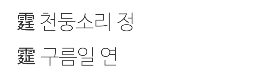 천둥소리 정은 비 우 雨 에 조정 정 廷을 합친 것이고, 구름일 연은 비 우 雨 에 늘일 연 延을 합친 것입니다.
