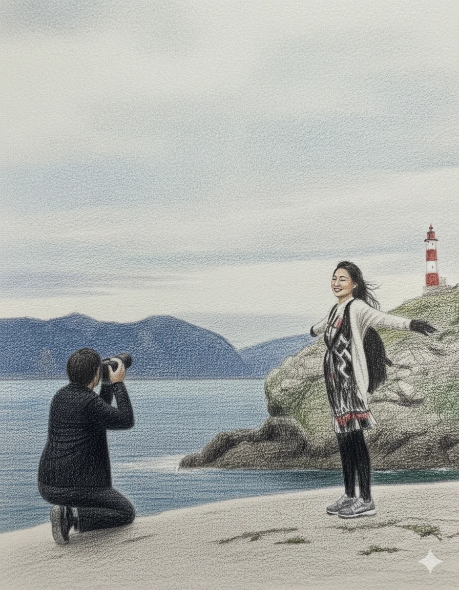통영에서 배를 타고 들어가려 했던 소매물도는 쿠크다스 광고 배경으로, 등대 사진으로 유명한 곳이다. 바람이 강해 소매물도를 못 가고 대매물도만 갈 수 있었다. 원하는 곳은 아니었지만 등대 사진을 찍었다. 그곳에서 찍힌 사진에는 등대를 배경으로 내가 서 있고, 멀리서 무릎을 꿇고 앉아 나를 향해 사진 찍는 그가 있다. 이 사진은 지나가던 분이 우리가 예뻐 보인다며 찍어주신 것이다. 즉석사진기로 찍어 바로 인화해서 선물로 주셨다. 우리는 우리를 멀리서 볼 수 있었다.