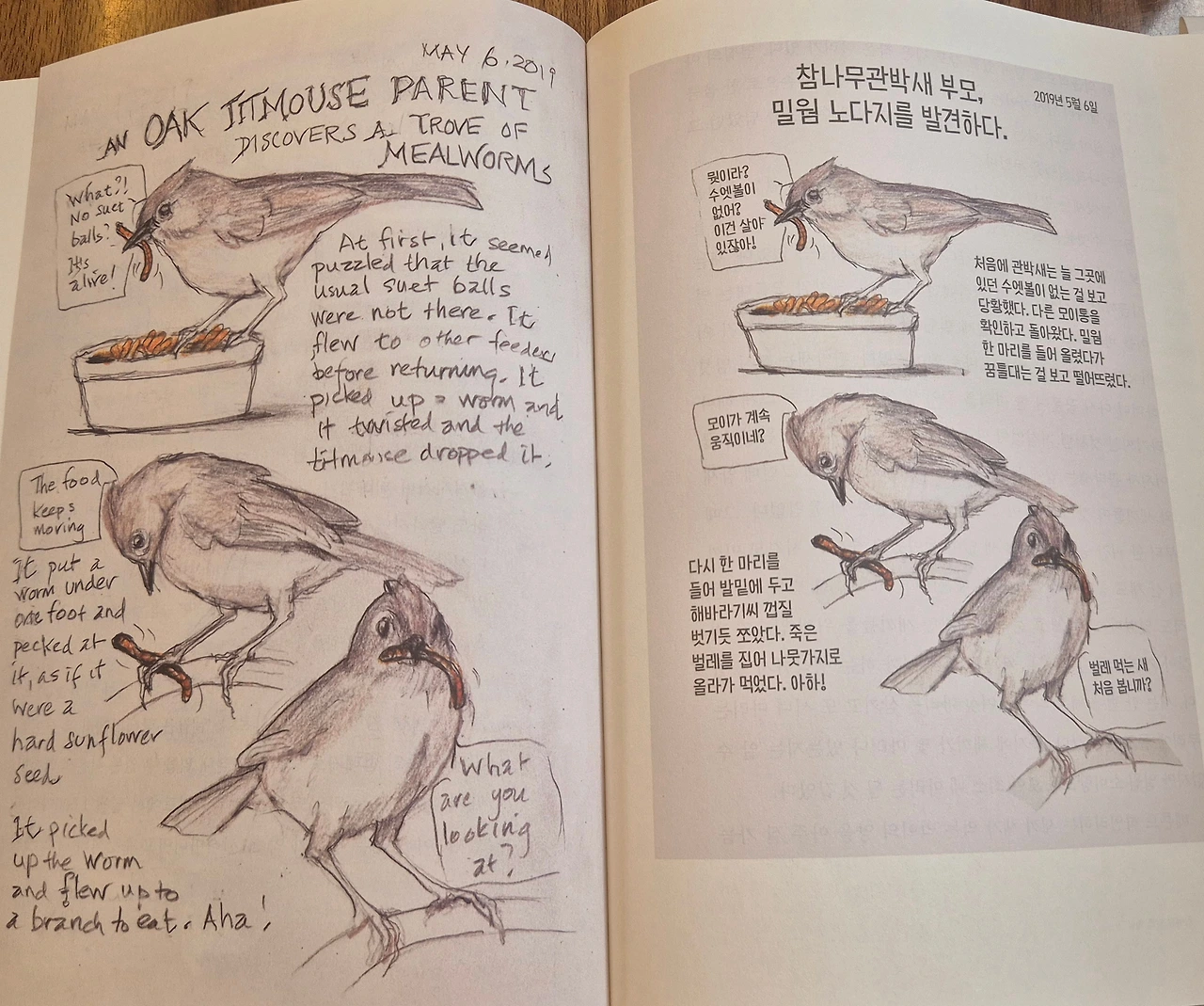 새로운 새의 소개, 새의 먹이들, 새의 습성을 에이미 탄이라는 망원경을 통해 보면 웃음이 나면서도 마음이 가벼워진다. 5년의 시간 동안 거의 매일 쓴 기록에서 추려낸 책이다 보니 그녀의 그림 솜씨가 늘어가는 것도 느껴진다. 새의 엉뚱한 행동을 보면 만화책 같기도 하다.