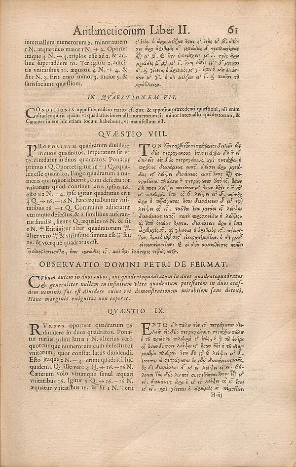 1670년 출간된 피에르 드 페르마의 주석이 달린 디오판토스의 《산술》(Arithmetica) 제2권 8번 문제(라틴어: Qvæstio VIII) 밑에 페르마의 마지막 정리가 있다