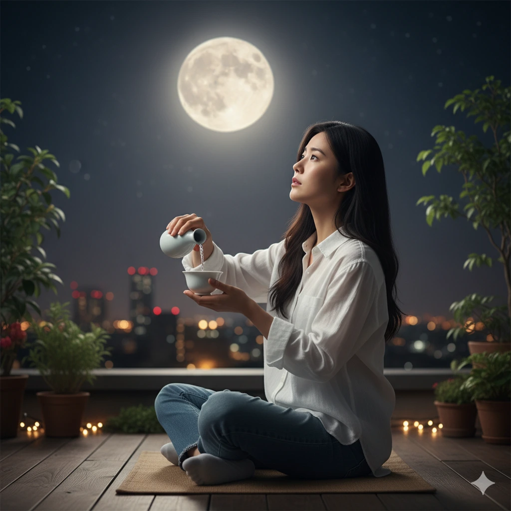 혼잣말을 하며 마루에 앉아 달을 본다. 회사에서 밀려드는 일을 끝내느라 저녁도 못 먹었다. 입맛이 없어 지하철을 타고 터벅터벅 걸어 집으로 돌아왔다. 잘 다려 입은 흰 셔츠가 구겨져있고, 일하느라 나도 모르게 소매를 접어놓았다. 마루에 앉아 지친 시선이 스르륵 올라가 하늘을 본다. 보름달이 떠있다. 하얀 달을 보니 하얀 도자기에 담겨있는 엄마가 담가주신 국화주가 떠올랐다. 안주도 없이 국화주를 꺼내온다.