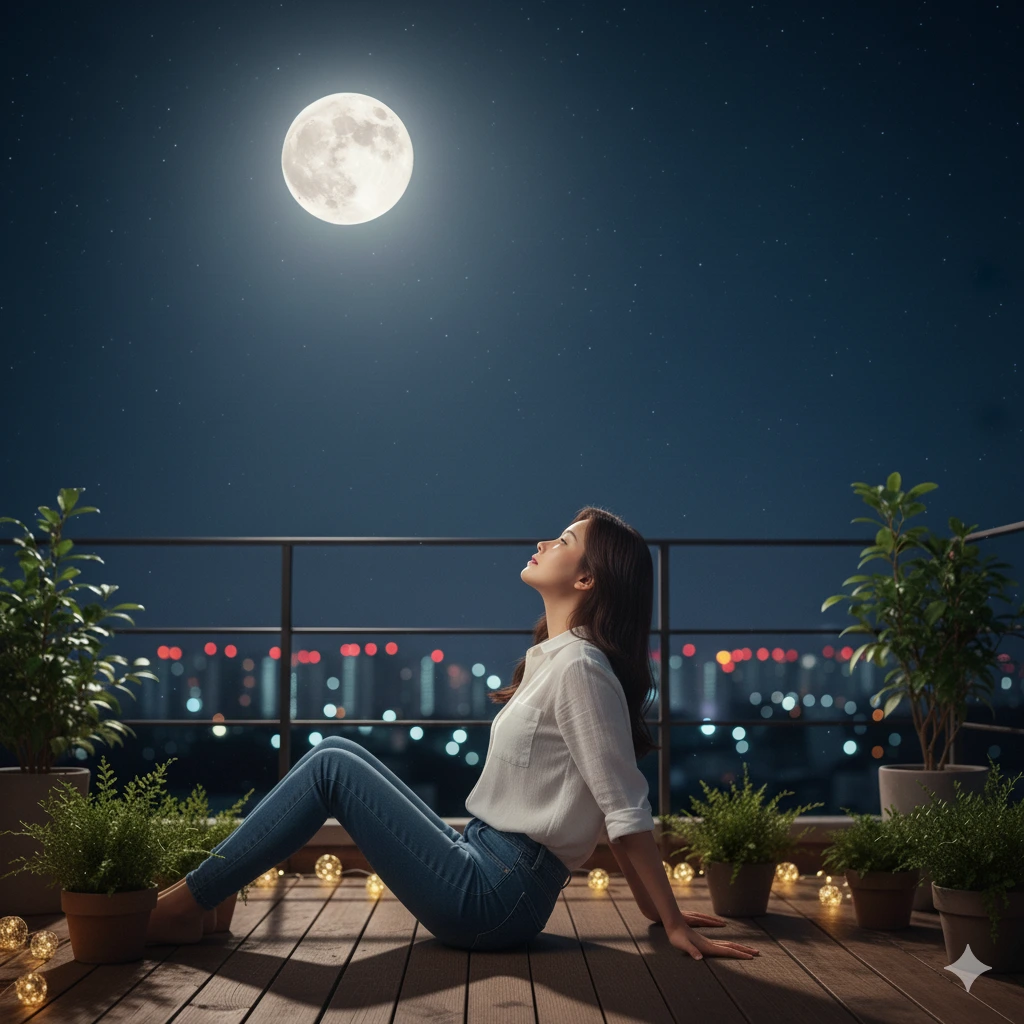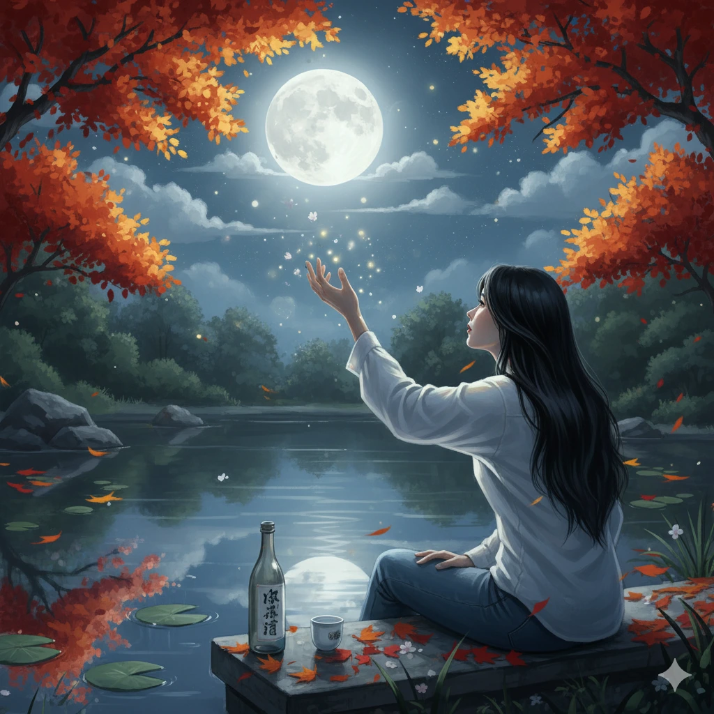 나는 단풍이 짙게 든 나무로 둘러싸인 어느 연못 앞 나무 의자에 앉아 있다. 달을 잡으려는 내 손길에 화답하듯 달빛이 내 손으로 내려앉는다. 손에 한기가 스쳤다. 깨끗하게 차가운 공기다.