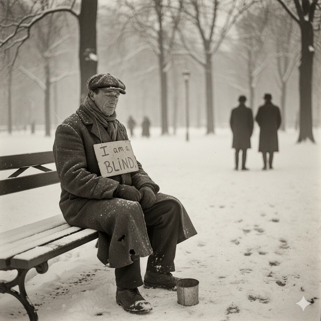 1920년 추운 겨울날, 어느 공원에서 시각장애인이 구걸하고 있었습니다. 그의 목에는 이런 문장이 적혀있었습니다.