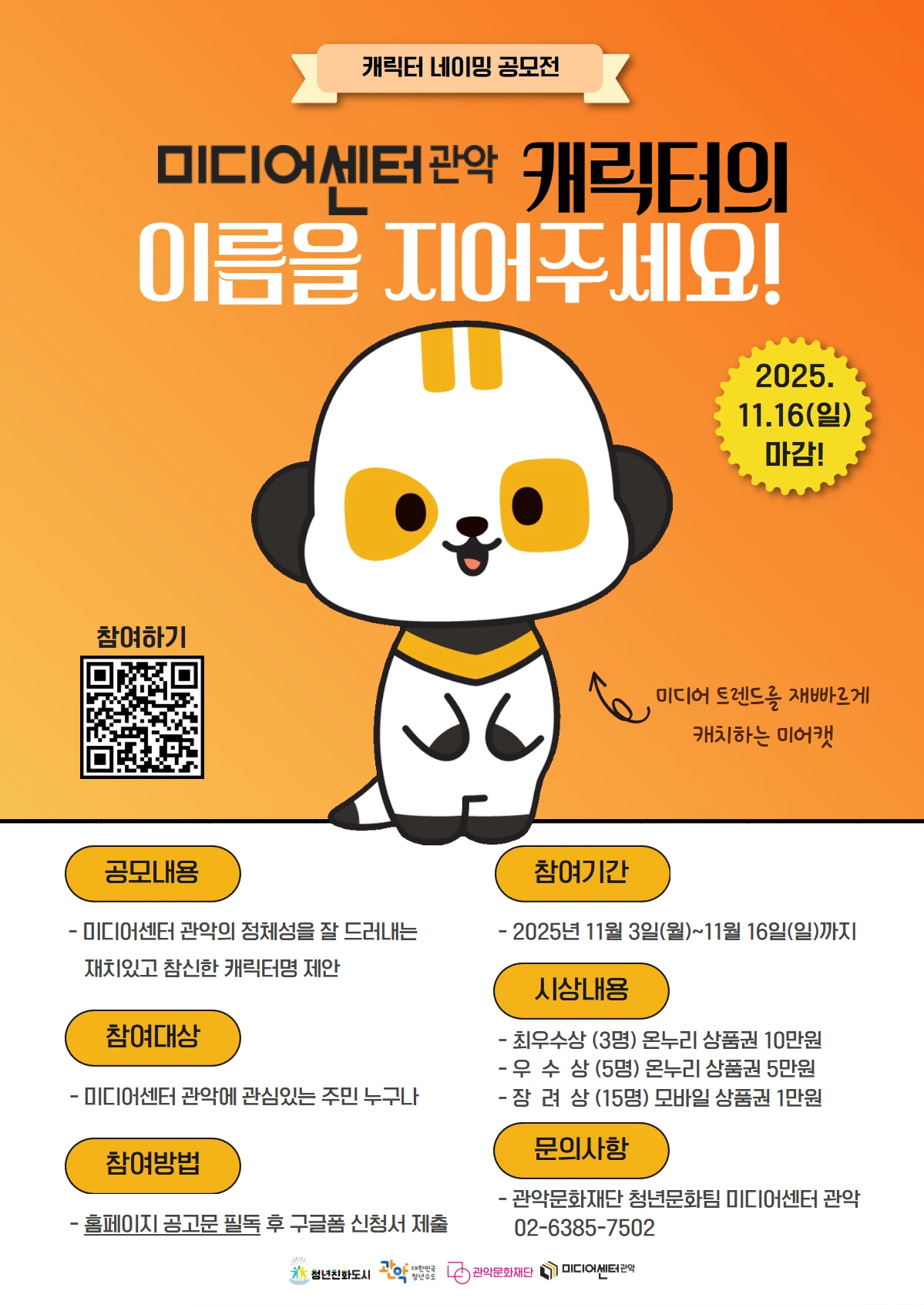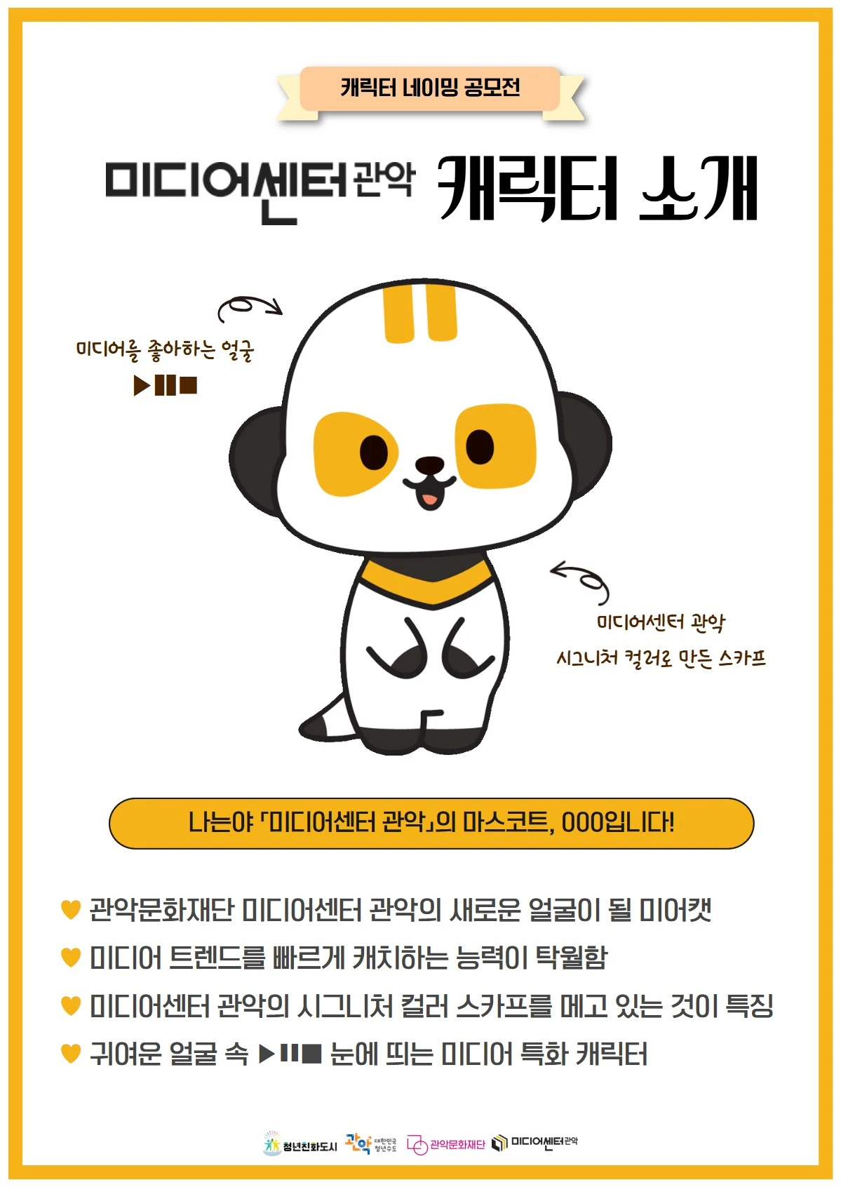 2025「미디어센터관악 캐릭터 네이밍 공모전」참여 신청서 안녕하세요! 미디어센터관악입니다. 우리 센터의 정체성과 지역의 따뜻한 에너지를 담은 새로운 캐릭터가 탄생합니다! � 이 캐릭터에 어울리는 이름을 함께 지어주세요. 여러분의 톡톡 튀는