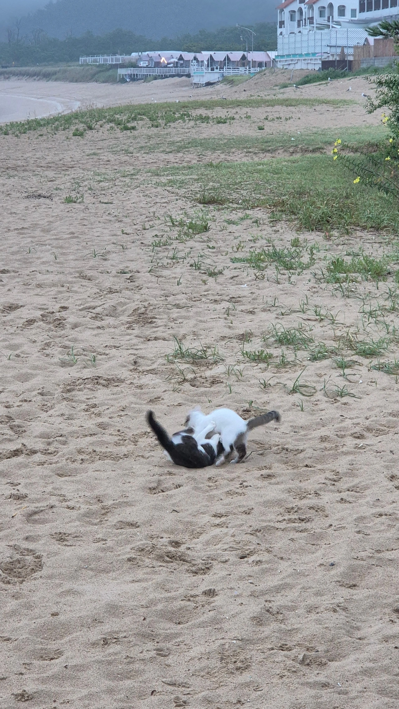 고양이 새끼가 4마리였는데, 아침에 해변에서 뛰어놀고 있었고, 엄마 고양이가 멀리서 지키고 있었습니다.
